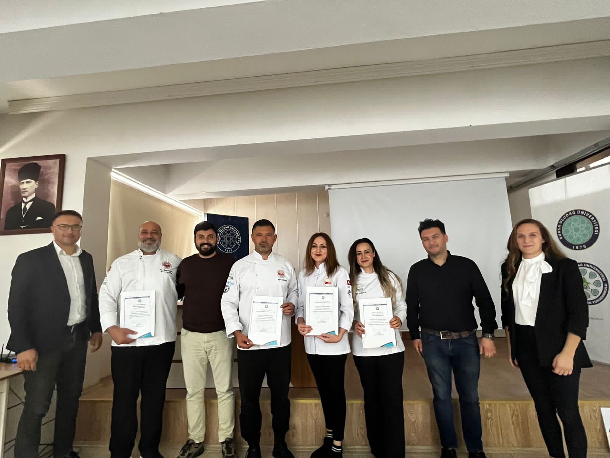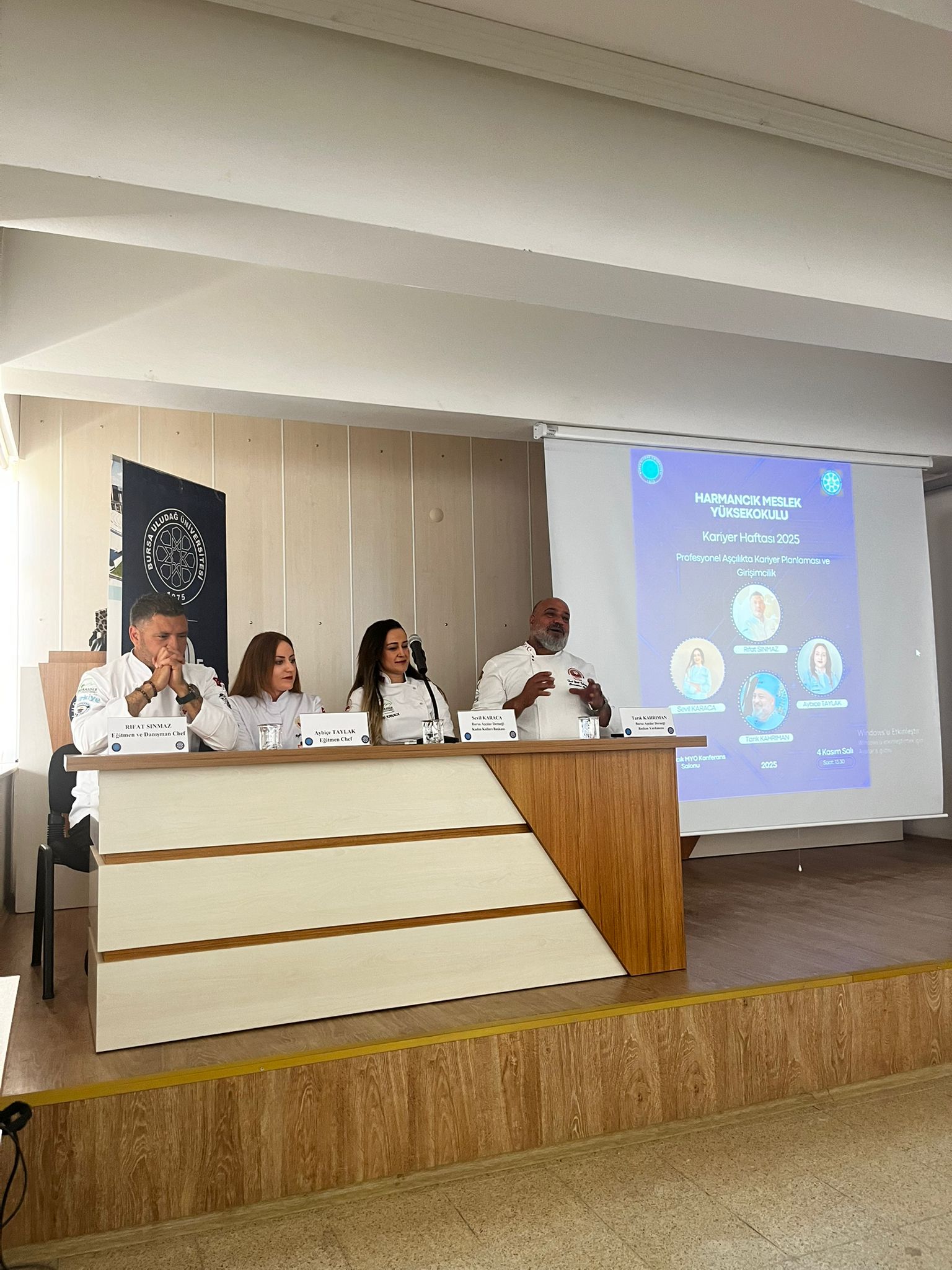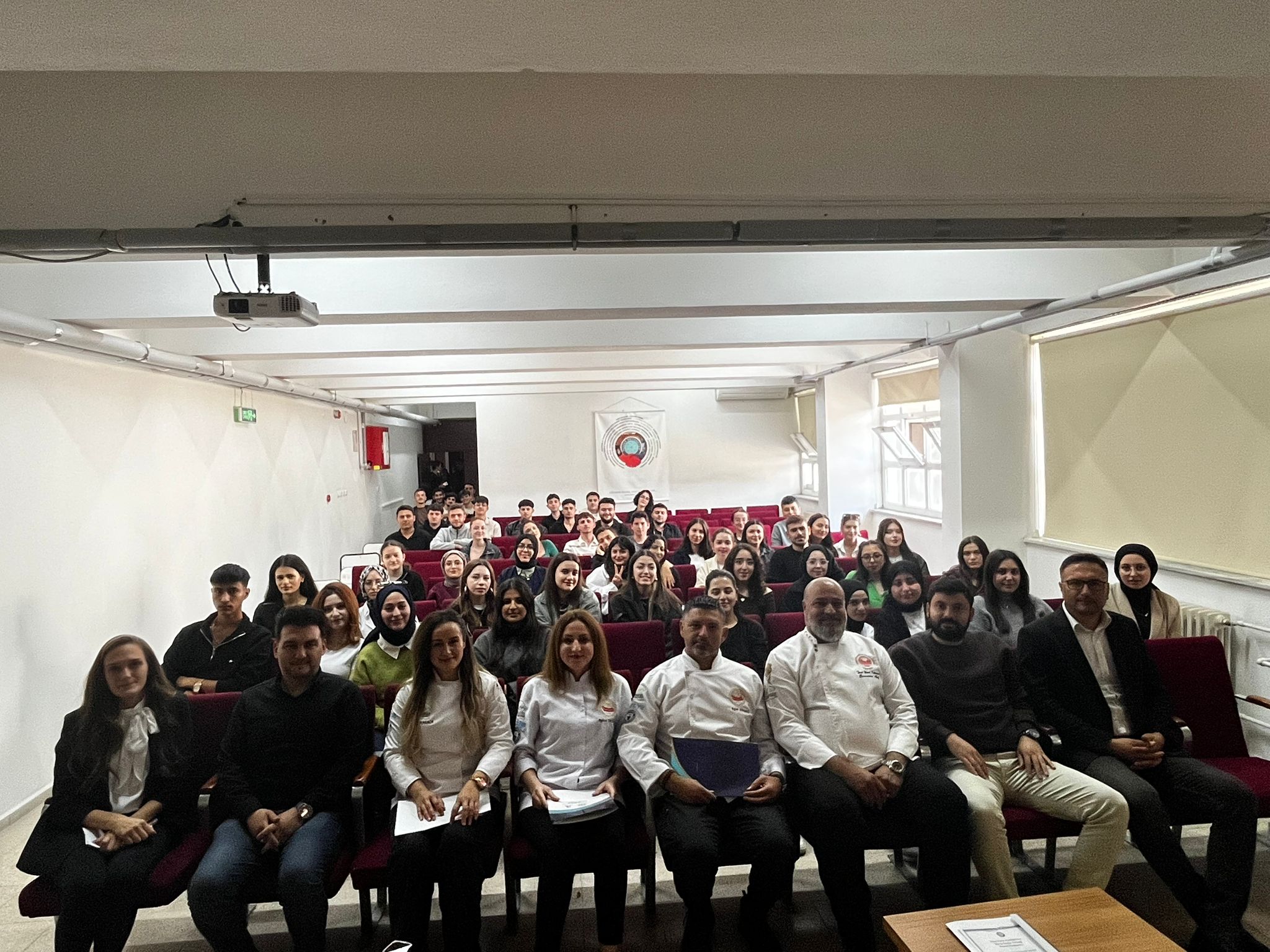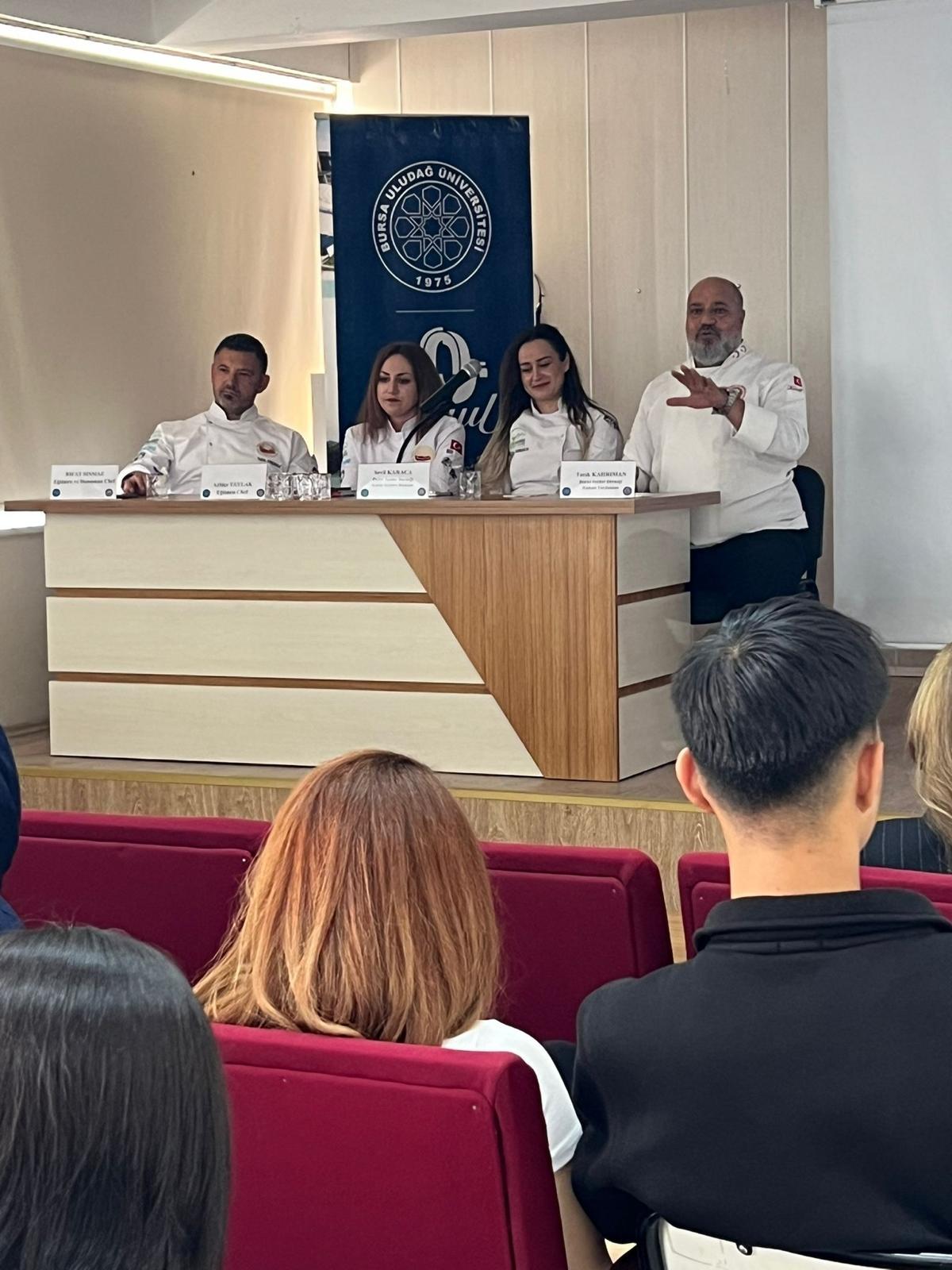 Aşçılık Programı kapsamında gerçekleştirilen etkinlikte, gastronomi sektörünün deneyimli isimleri öğrencilerle bir araya geldi. Konuklar, Sevil Karaca (Bursa Aşçılar Derneği Kadın Kolları Başkanı), Tarık Kahrıman (Bursa Aşçılar Derneği Başkan Yardımcısı ve Tarık Üstad İşletme Sahibi), Rıfat Sınmaz (İnoksan Şirketi Eğitmen ve Danışman Aşçısı) ve Aybiçe Taylak (Gastroakademi Eğitmen Şef) oldu. Katılımcılar, sektörde kariyer yolculuğu, mutfak disiplini, profesyonel ekip yönetimi ve yaratıcı sunum teknikleri üzerine paylaşımda bulundular.