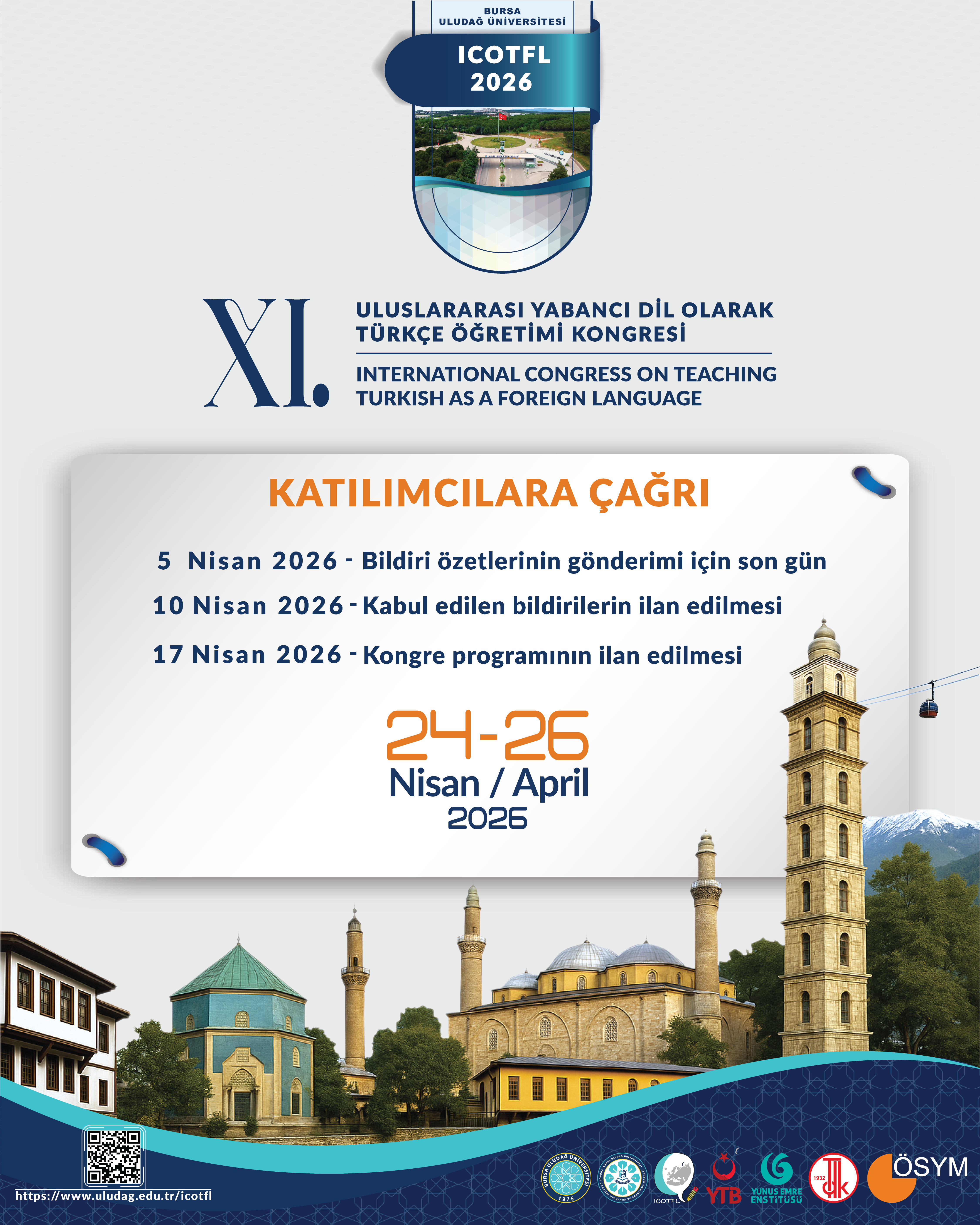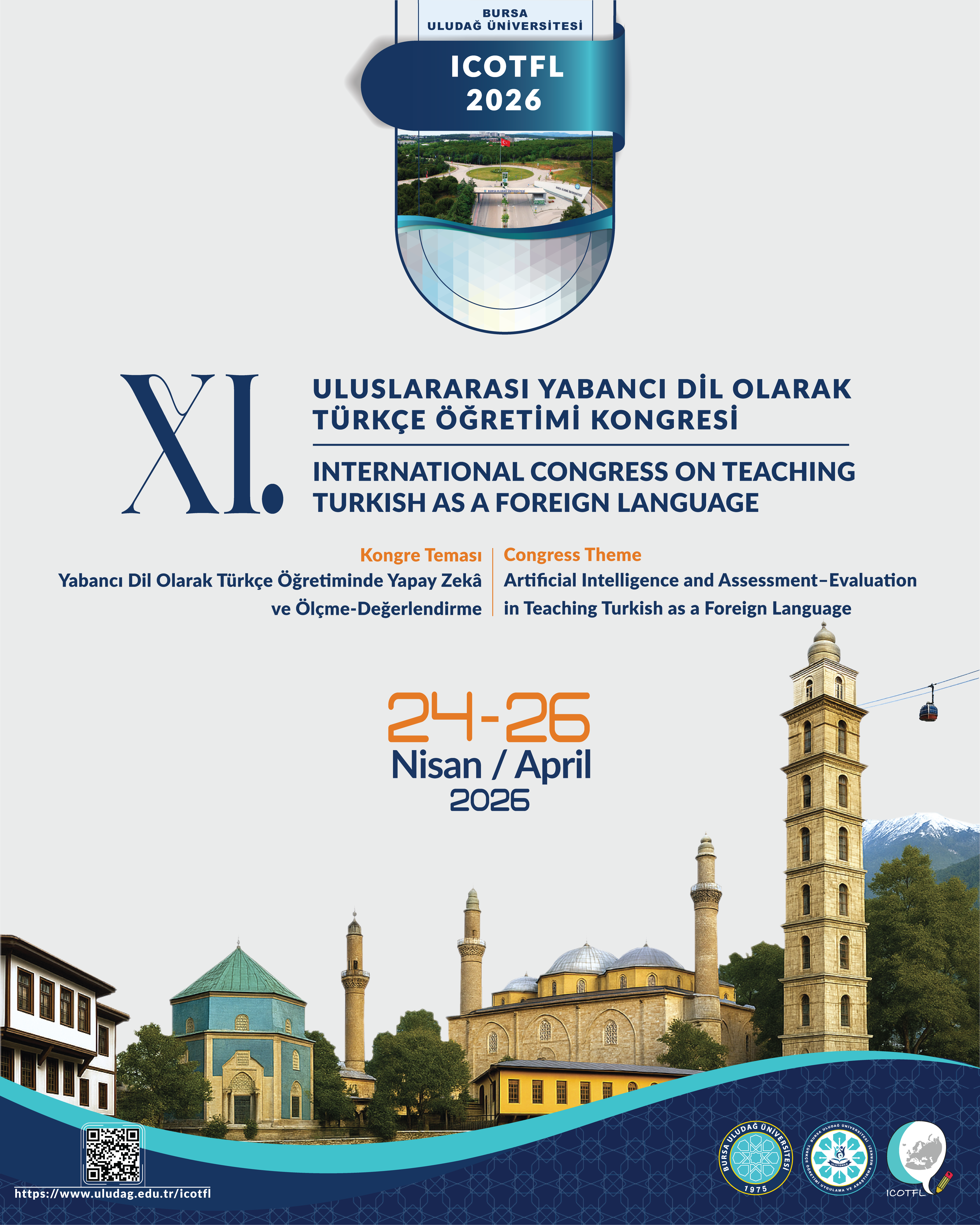 XI. Uluslararası Yabancı Dil Olarak Türkçe Öğretimi Kongresi (International Congress of Teaching Turkish as a Foreign Language – ICOTFL 2026) Bursa Uludağ Üniversitesi ev sahipliğinde Türkçe Öğretimi Uygulama ve Araştırma Merkezi (ULUTÖMER) ile Eğitim Fakültesi Türkçe ve Sosyal Bilimler Eğitimi Bölümü koordinasyonunda yüz yüze ve çevrim içi (sadece yurt dışı katılımcıları için) olarak gerçekleştirilecektir.
