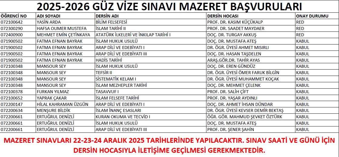 2025-2026 EĞİTİM-ÖĞRETİM YILI GÜZ YARIYILI ARA SINAV MAZERET SINAVI BAŞVURU SONUÇLARI VE SINAV TARİHLERİ