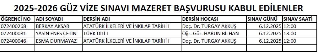 TÜRK DİLİ I-ATATÜRK İLKELERİ VE İNK. TARİHİ ARA SINAV MAZERET SINAVI BAŞVURU SONUÇLARI VE SINAV TARİHLERİ