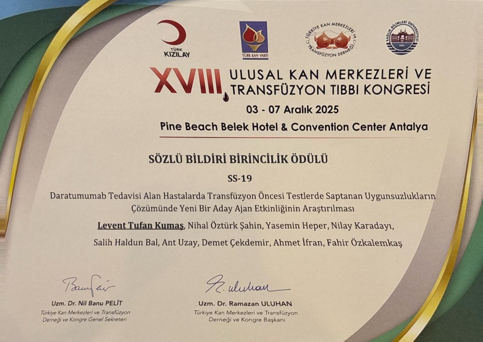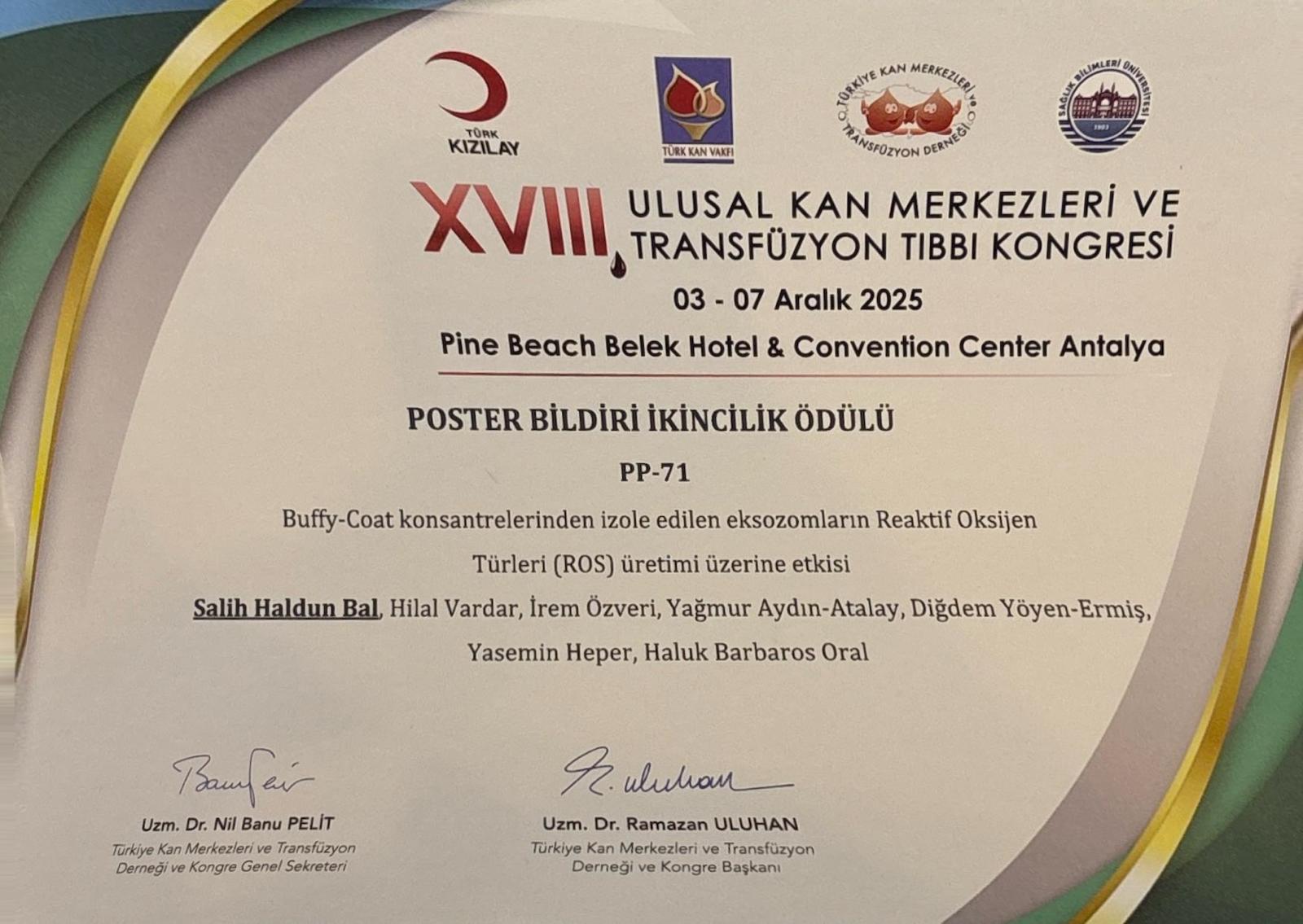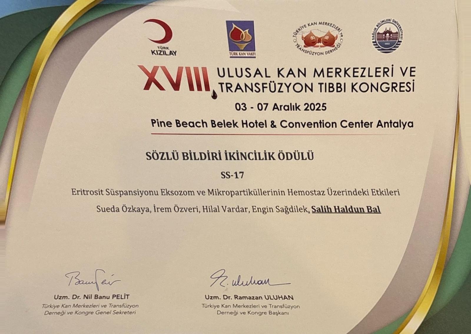 Ayrıca Dr. Öğr. Üyesi Salih Haldun Bal’ın yer aldığı çalışmalardan; “Daratumumab Tedavisi Alan Hastalarda Transfüzyon Öncesi Testlerde Saptanan Uygunsuzlukların Çözümünde Yeni Bir Aday Ajan Etkinliğinin Araştırılması” başlıklı sözlü bildiri birincilik ödülüne, “Eritrosit Süspansiyonu Eksozom ve Mikropartiküllerinin Hemostaz Üzerindeki Etkileri” başlıklı sözlü bildiri ikincilik ödülüne, “Buffy-Coat Konsantrelerinden İzole Edilen Eksozomların Reaktif Oksijen Türleri (ROS) Üretimi Üzerine Etkisi” başlıklı çalışma ise poster bildiri ikincilik ödülüne layık görüldü.