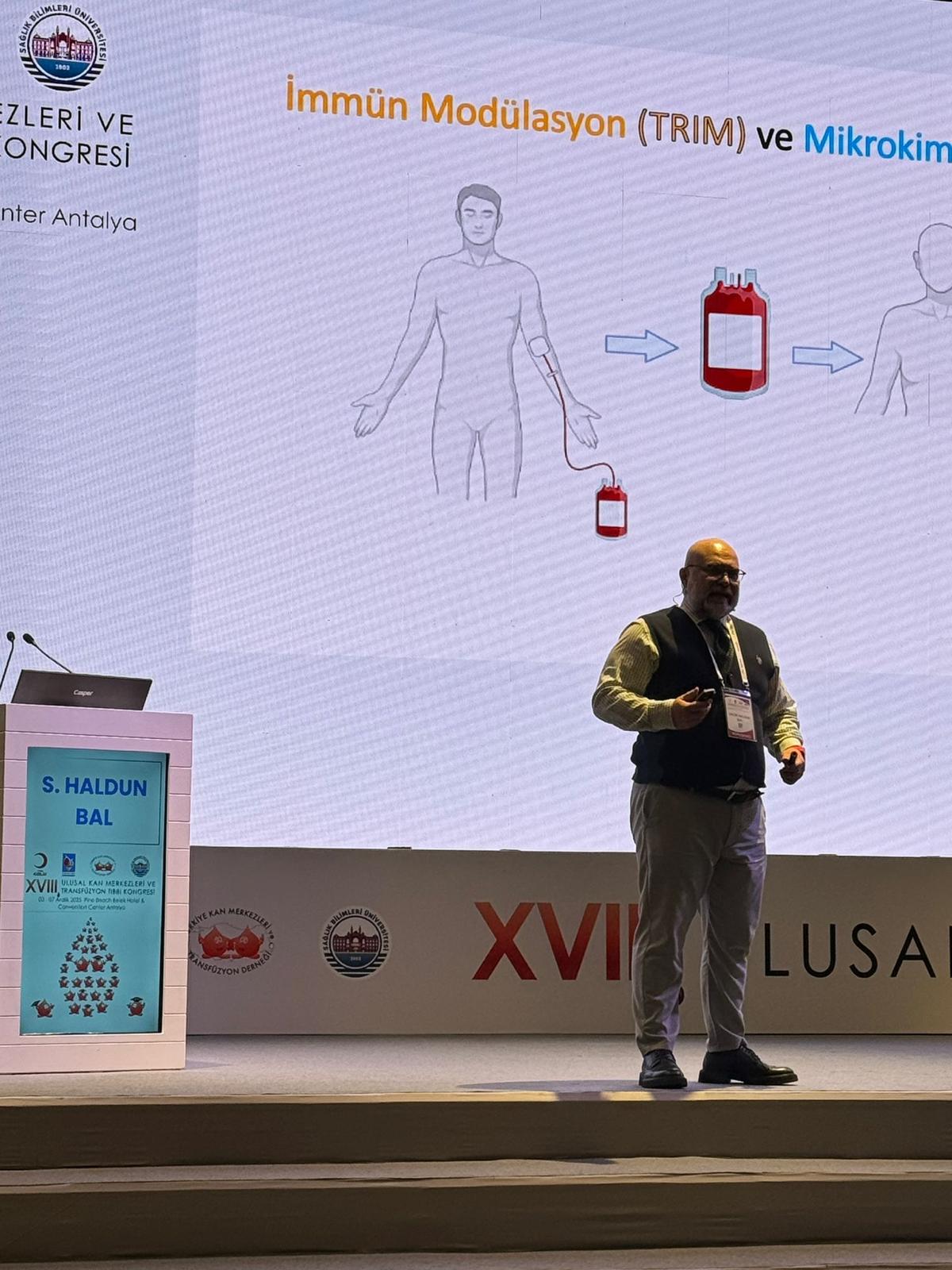 Ana Bilim Dalımız öğretim üyelerinden Dr. Öğr. Üyesi Salih Haldun Bal, kongre kapsamında düzenlenen Transfüzyon İmmünolojisi oturumunda “Transfüzyon İlişkili İmmünmodülasyon ve Mikrokimerizm” başlıklı konuşmasını gerçekleştirdi.