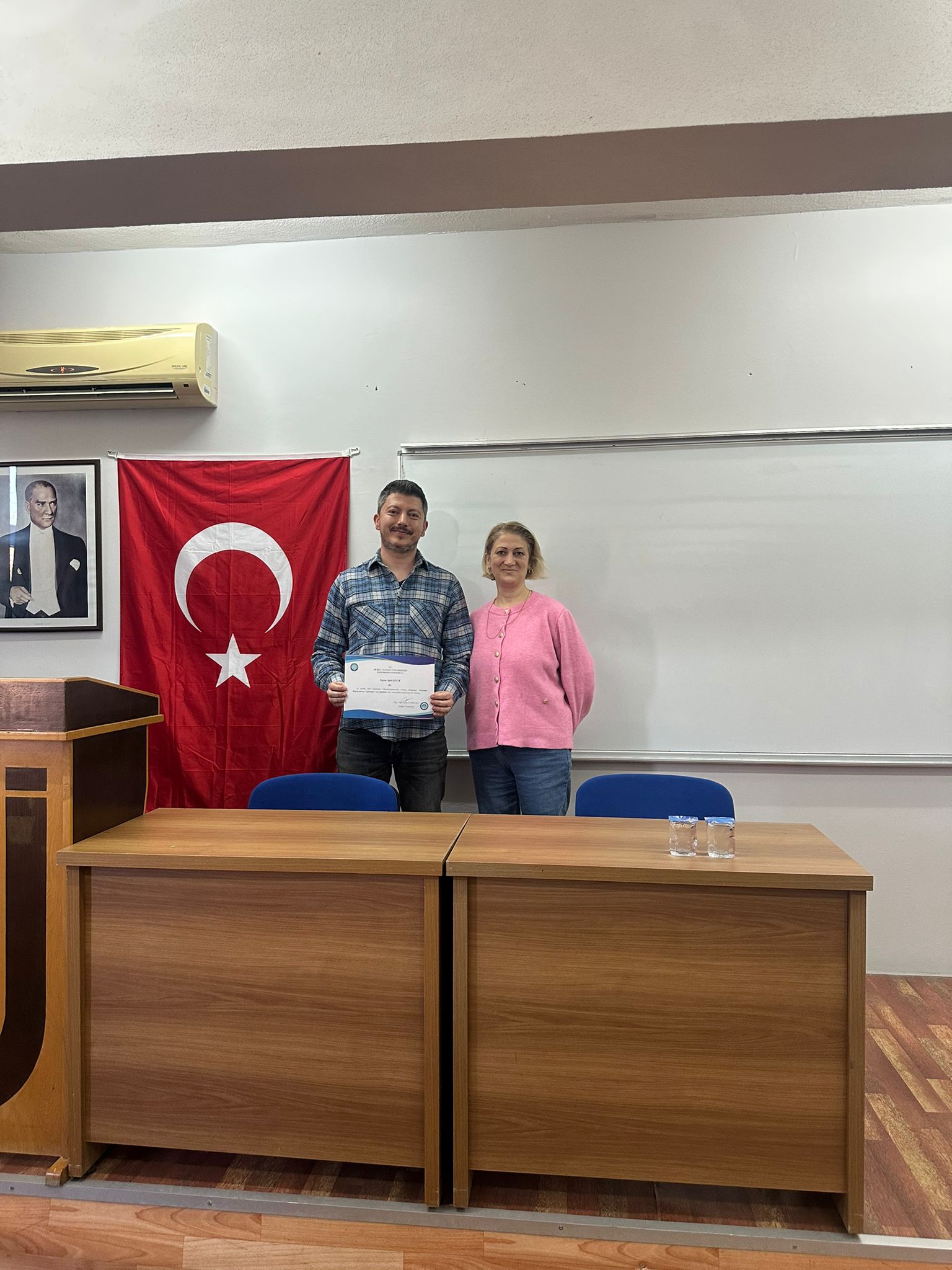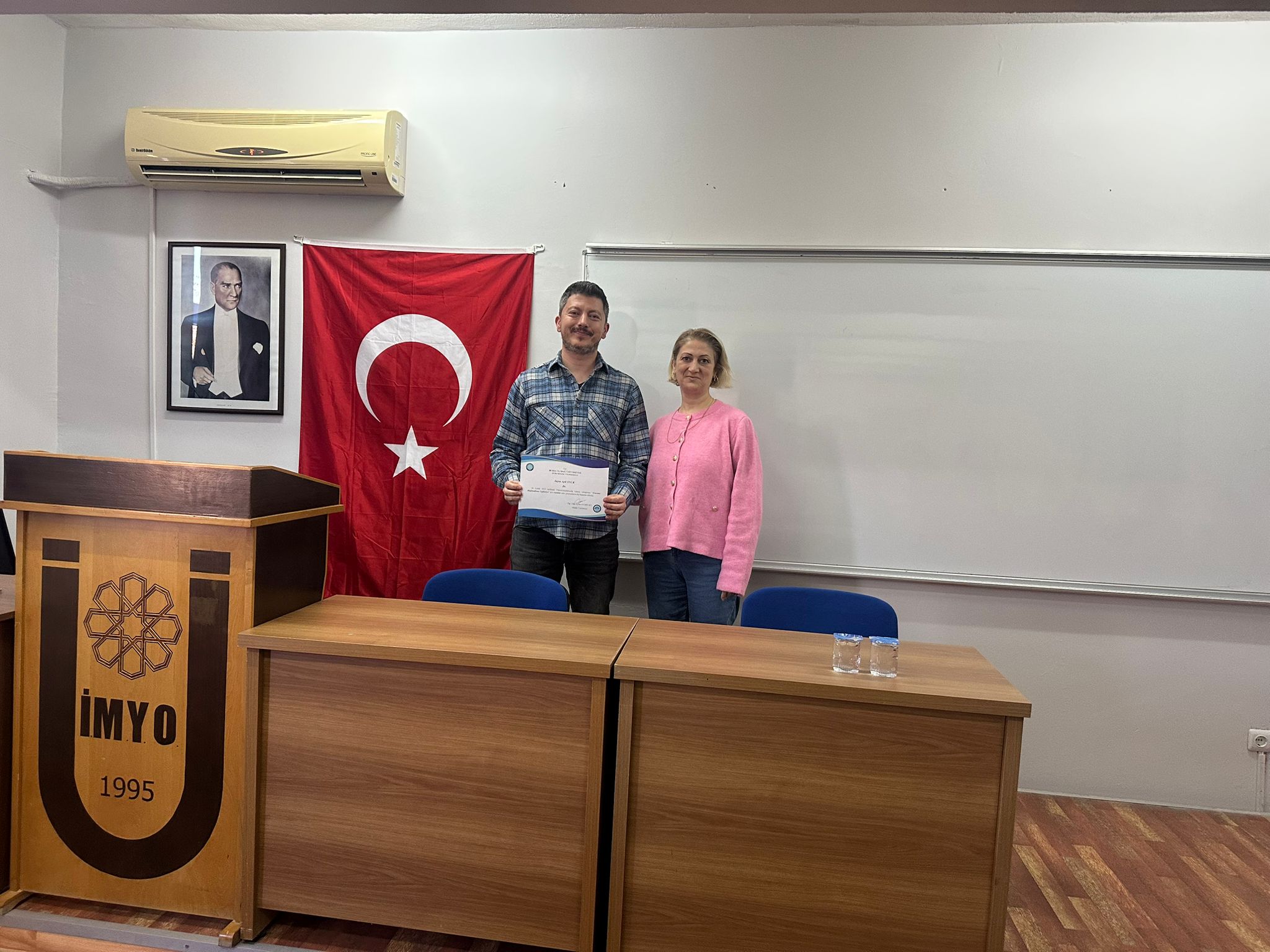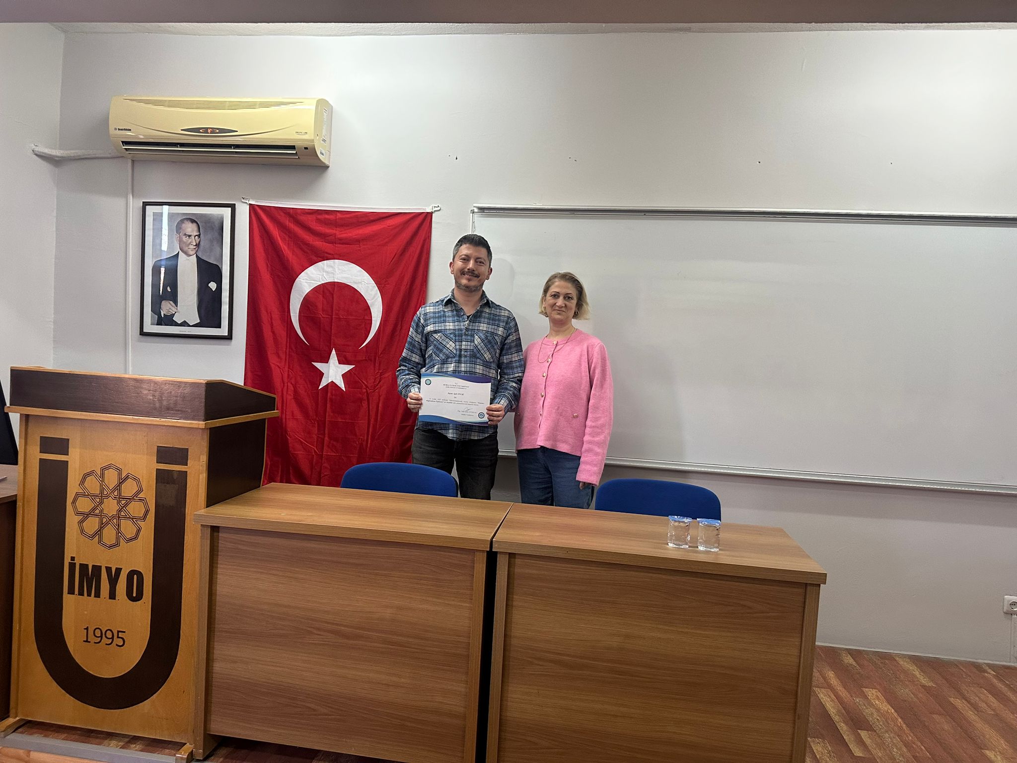 Bilgilendirme seminerinin sonunda, İznik MYO Müdür Yardımıcısı Öğretim Görevlisi Aylin AYDIN SEL tarafından Erasmus Koordinatörlüğü Proje Uzmanı Dr. Apti Onuk’ a teşekkür belgesi takdim edildi.