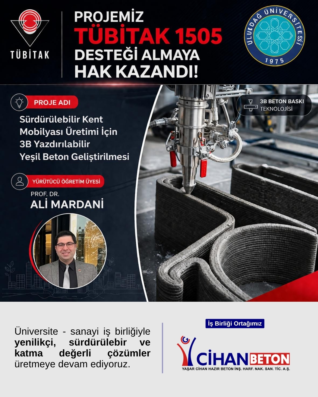 "Sürdürülebilir Kent Mobilyası Üretimi İçin 3B Yazdırılabilir Yeşil Beton Geliştirilmesi" projemiz, TÜBİTAK 1505 - Üniversite-Sanayi İş Birliği Destek Programı kapsamında destek almaya hak kazandı!