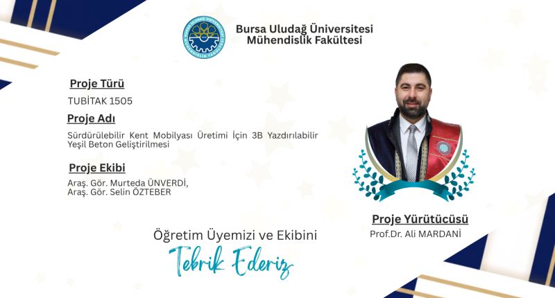 Bursa Uludağ Üniversitesi İnşaat Mühendisliği Bölümü bünyesinde yürütülen "Sürdürülebilir Kent Mobilyası Üretimi İçin 3B Yazdırılabilir Yeşil Beton Geliştirilmesi" başlıklı TÜBİTAK 1505 - Üniversite-Sanayi İşbirliği Destek Programı projesinin kabul edilmesinden büyük mutluluk duyuyoruz.