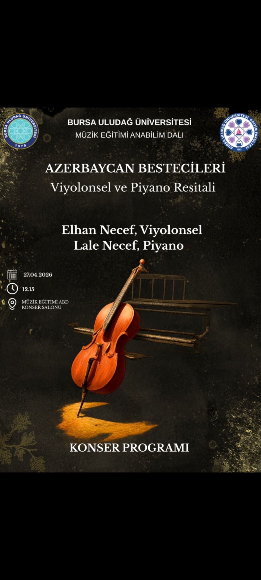 Bursa Uludağ Üniversitesi Eğitim Fakültesi Müzik Eğitimi Anabilim Dalı tarafından düzenlenen “Azerbaycan Bestecileri Viyolonsel ve Piyano Resitali”, 27 Nisan 2026 tarihinde Müzik Eğitimi ABD Konser Salonu’nda sanatseverlerle buluştu. Etkinlik, akademik çevrelerden, öğrencilerden ve sanatseverlerden yoğun ilgi gördü.