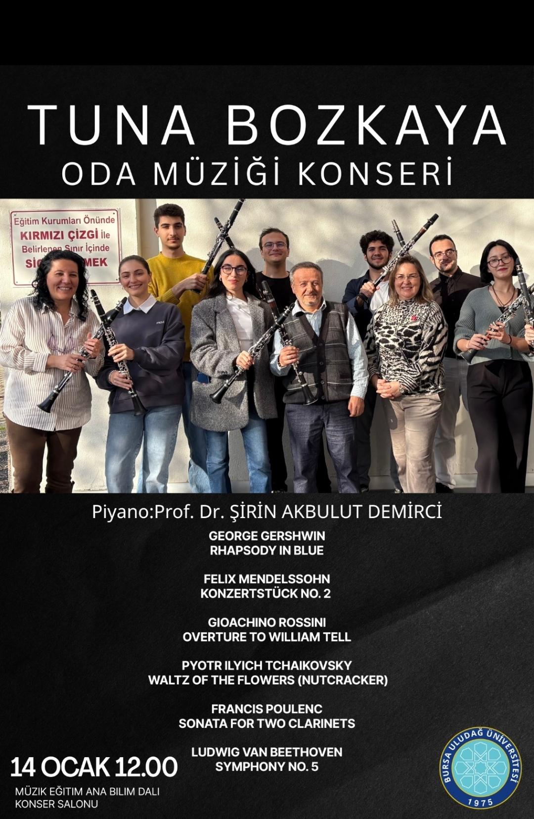 Bursa Uludağ Üniversitesi Müzik Eğitimi Anabilim Dalı Konser Salonu 14 Ocak tarihinde anlamlı bir oda müziği konserine ev sahipliği yaptı. Tuna Bozkaya hocamızın Klarinet Sınıfı Oda Müziği Konseri akademisyenler ve öğrencilerin katılımıyla başarıyla gerçekleştirildi.
