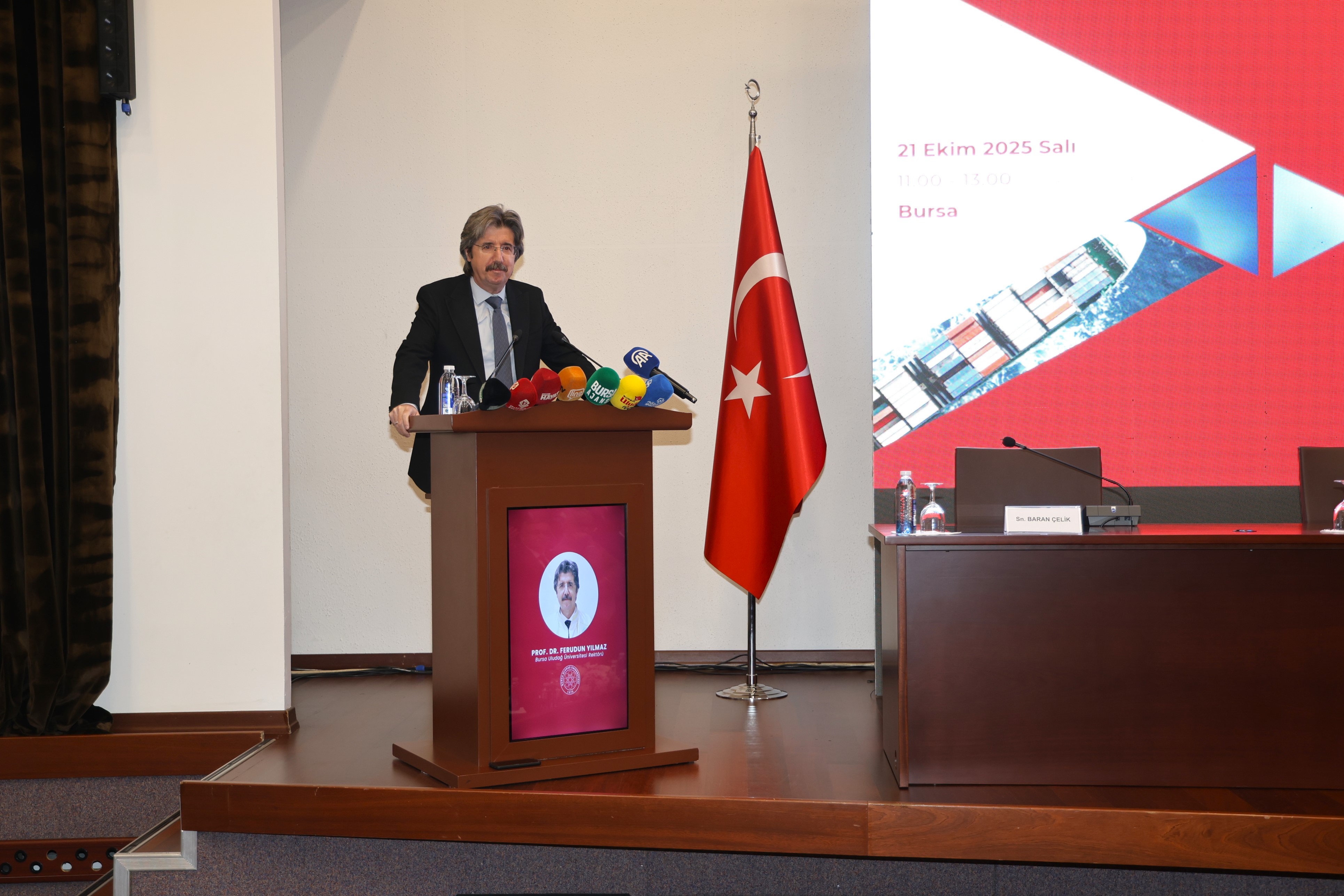 Türkiye’nin sadece iç piyasaya üretim yapmasının, ekonomiyi sabit sınırlar içinde tutacağını vurgulayan Prof. Dr. Ferudun Yılmaz; “Bu ölçekle dünya rekabeti içerisinde muhtemel tutabileceğimiz yer belli. Ancak dünya piyasaları içerisinde daha güçlü bir yer edinebilmemiz için daha geniş yelpazede ve güçlü sektörlerle ihracatta daha güçlü bir biçimde ilerlemeliyiz. Bursa bu açıdan potansiyeli en yüksek şehirlerin başında geliyor. Bir araştırma üniversitesi olan Bursa Uludağ Üniversitesi de bir yandan ülkenin beşeri sermayesine nitelikli katkılar yapmaya devam ederken, öte yandan da bugün olduğu gibi, eğitim altyapısı ve yetkinliğini kullanarak doğrudan sektöre hizmet verecek şekilde kamu ve özel kurumlarla işbirliklerini hayata geçiriyor” ifadelerini kullandı.