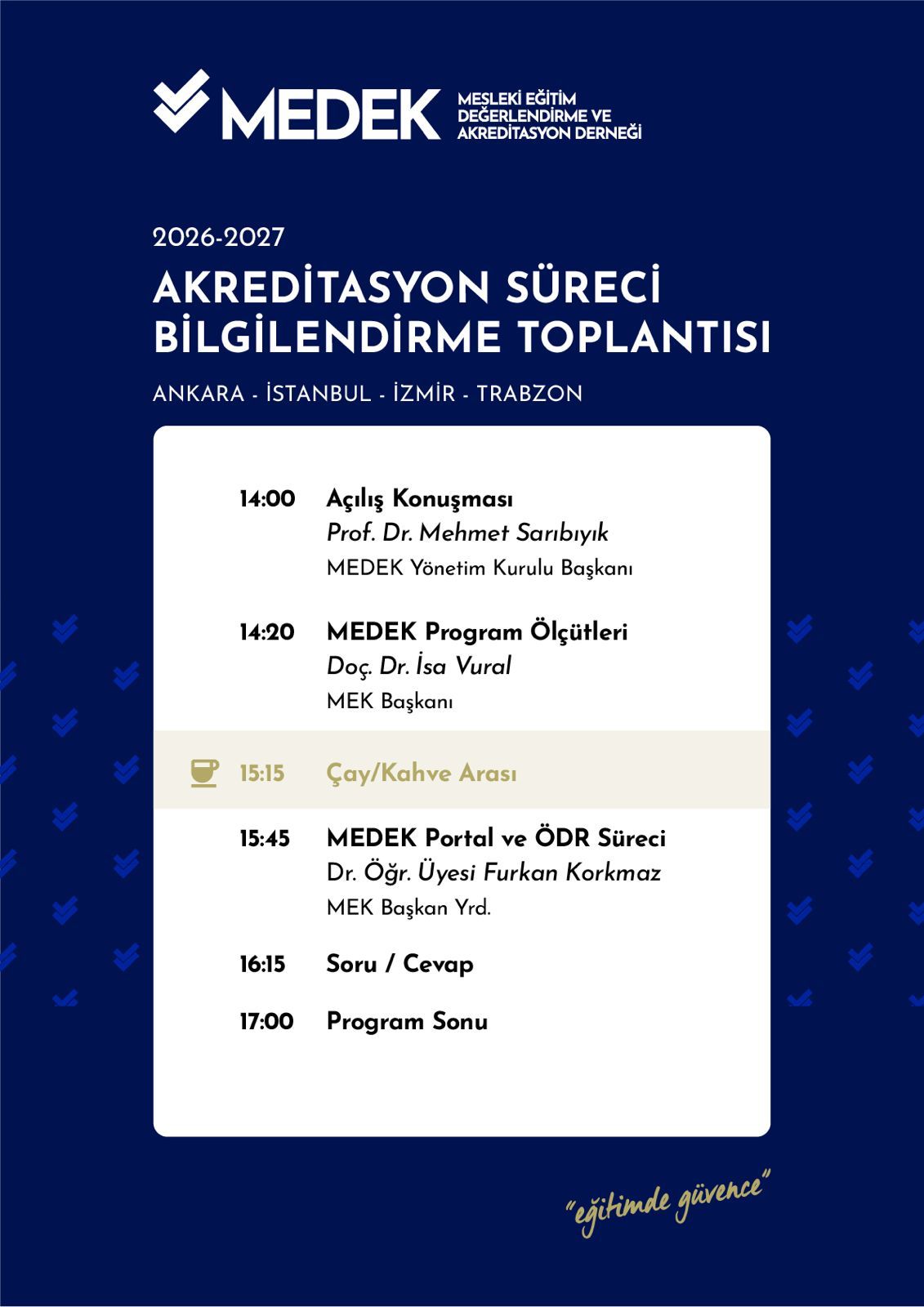 Mesleki Eğitim Değerlendirme ve Akreditasyon Derneği (MEDEK) tarafından düzenlenen 2026–2027 Akreditasyon Süreci Bilgilendirme Toplantıları, Ankara ilinde başarıyla gerçekleştirildi.
