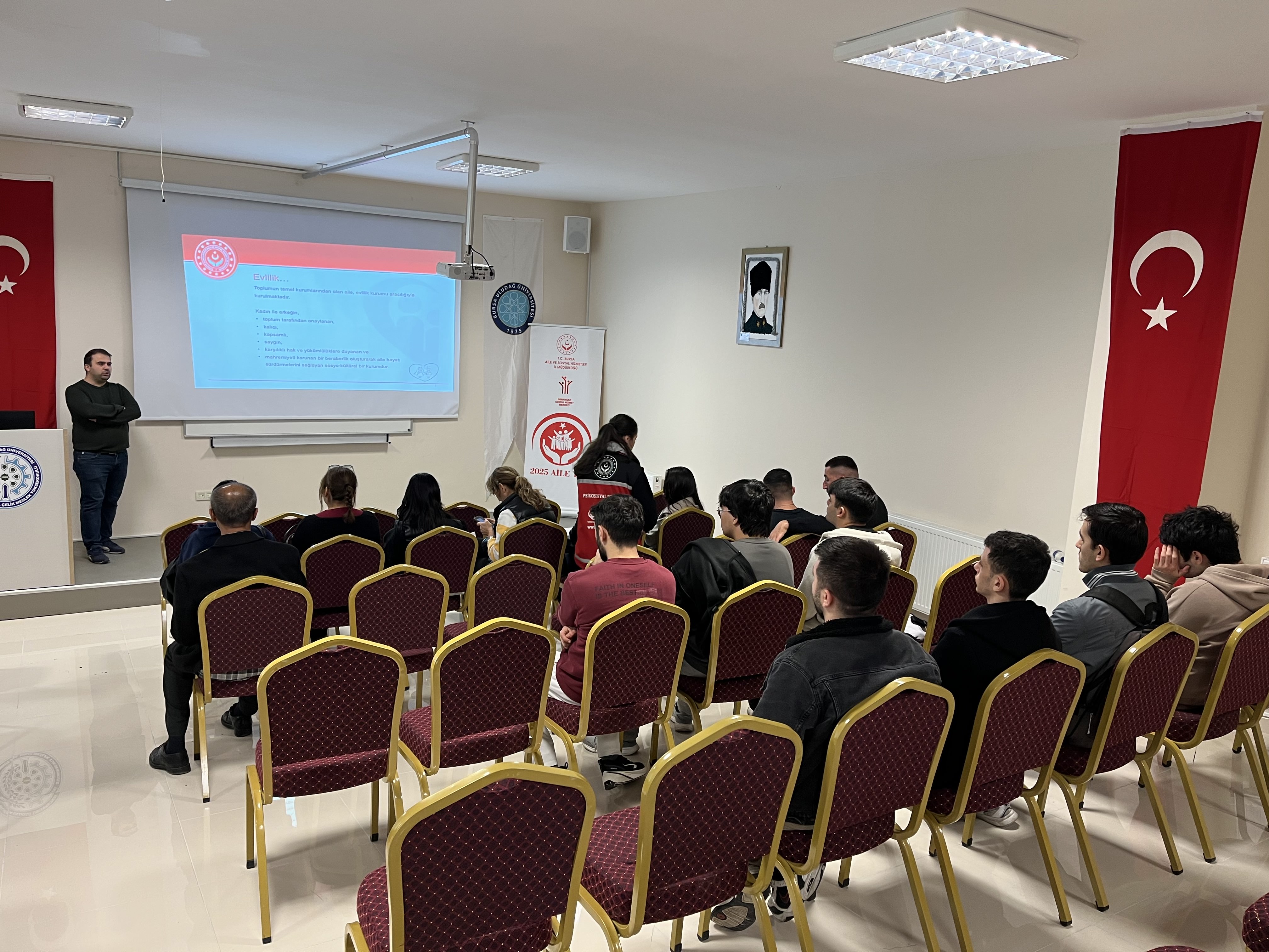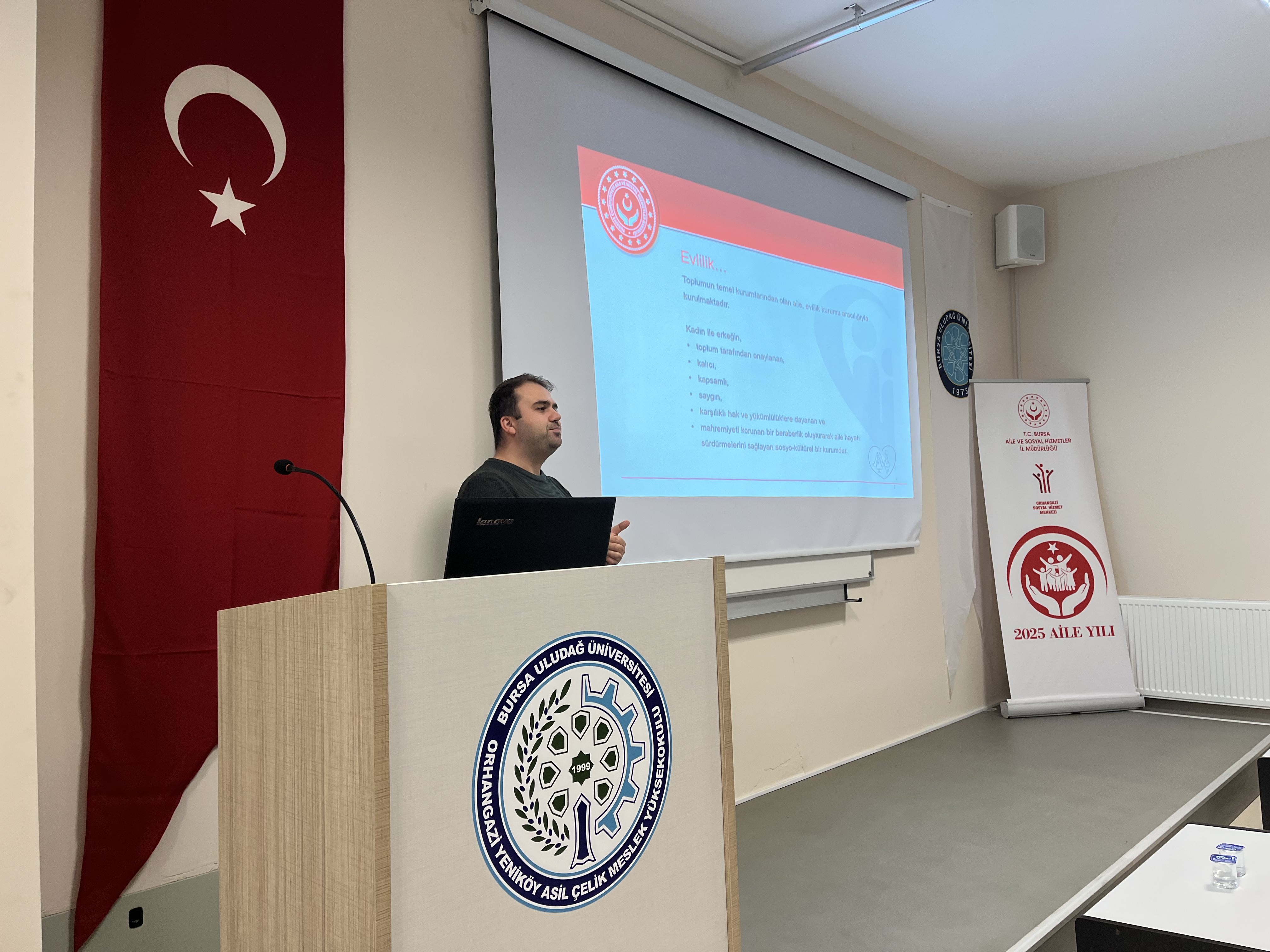 Bursa Uludağ Üniversitesi Orhangazi Yeniköy Asil Çelik Meslek Yüksekokulu’nda, Orhangazi İlçe Sosyal Hizmet Merkezi Müdürlüğü tarafından “Evlilik Öncesi Eş Seçimi ve Sağlıklı İlişki Dinamikleri” konulu bilgilendirme semineri düzenlendi.
