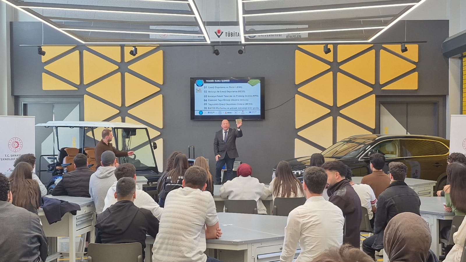 T.C. Sanayi ve Teknoloji Bakanlığı koordinasyonunda yürütülen Milli Teknoloji Hamlesi kapsamında, TÜBİTAK iş birliğiyle düzenlenen etkinlikler çerçevesinde Bilim ve Teknoloji Haftası'nın açılışı Bursa Uludağ Üniversitesi Mühendislik Fakültesi Dekanı Sayın Prof.Dr Ali Rıza YILDIZ'in konusmaları ile başladı. Otomotiv Mühendisliği Bölüm Başkanı ve BATEG Platformu Yürütücüsü Sayın Prof. Dr. Gökhan SEVİLGEN’in “Enerji Depolama Teknolojileri” başlıklı söyleşisi ile devam eden etkinlikte enerji depolama teknolojileri çatısı altında batarya teknolojileri hakkında hücre seviyesinden paket seviyesine kadar gerçekleştirilen mühendislik çalışmaları konusunda katılımcılar bilgilendirdi. Üniversitemiz bünyesinde kurulu olan Elektrikli Taşıtlar İçin Batarya Teknolojileri Araştırma ve Geliştirme Platformu (BATEG) Laboratuvarı altyapısı ve yetkinliklerinin de aktarıldığı söyleşi soru-cevap bölümü ile sona erdi. Etkinlikte emeği geçen herkese başta Bursa Uludağ Üniversitesi Milli Teknoloji Atölyesi Yöneticisi Hilal KARABULUT olmak üzere teşekkür ederiz.