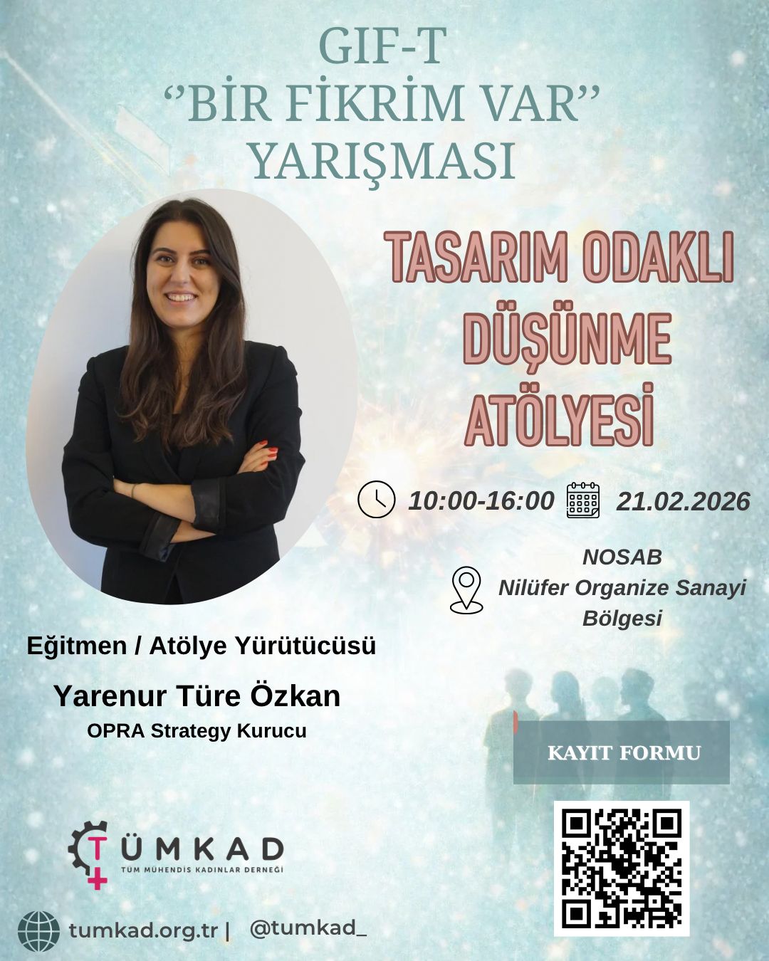 TÜMKAD – Türk Üniversiteli Kadınlar Derneği bünyesinde faaliyet gösteren GIF Komisyonu (Girişimcilik, İnovasyon, Gelecek ve Teknoloji) tarafından düzenlenen GIF-T“Bir Fikrim Var” Ideathonu, 18–28 yaş arasındaki gençlerin iş fikirlerini geliştirmesi, güçlendirmesi ve görünür kılması amacıyla hayata geçirilmektedir. Ideathon; fikir aşamasındaki projelerin mentorluk, ekip çalışması ve uygulama odaklı çalışmalarla yapılandırılmasını hedefleyen yüz yüze ve yoğun bir deneyim programıdır.