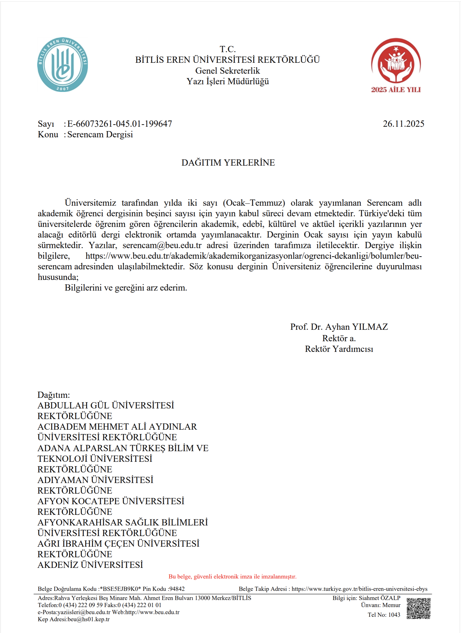 T.C. Bitlis Eren Üniversitesi Rektörlüğü tarafından gönderilen, ek yazıda bilgileri bulunan "Serencam" dergisi