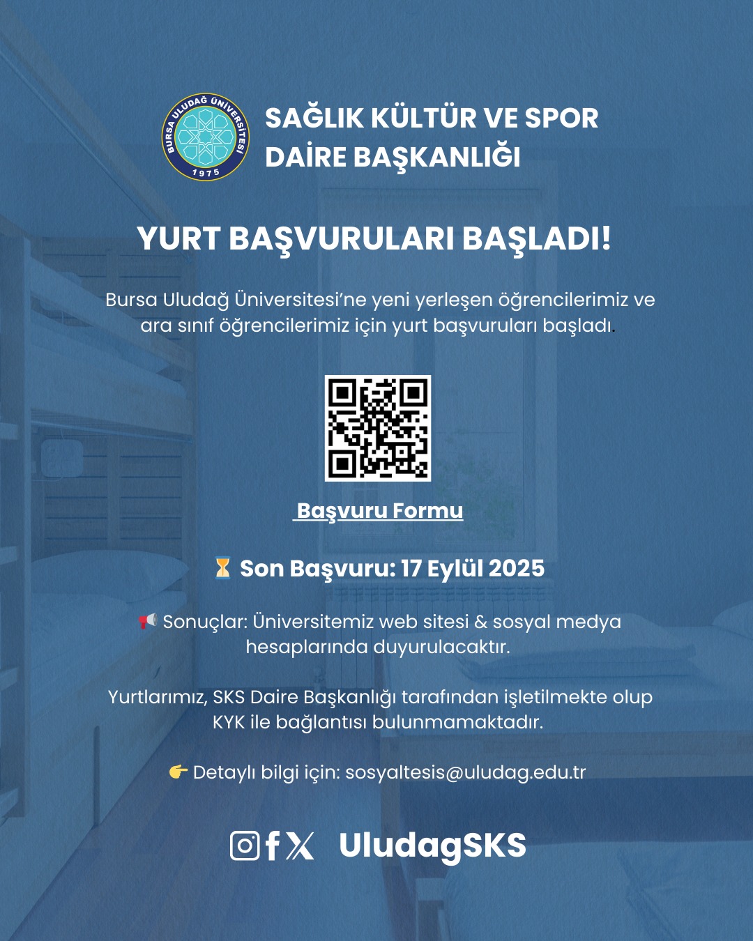 2025-2026 Eğitim-Öğretim yılında Üniversitemize yerleşmeye hak kazanarak kaydını yaptıran öğrencilerimiz ile Bursa Uludağ Üniversitesi’nin kayıtlı ara sınıf öğrencileri, Üniversitemize bağlı ilçe öğrenci yurtlarına aşağıdaki link üzerinden online başvuru yapabilirler: