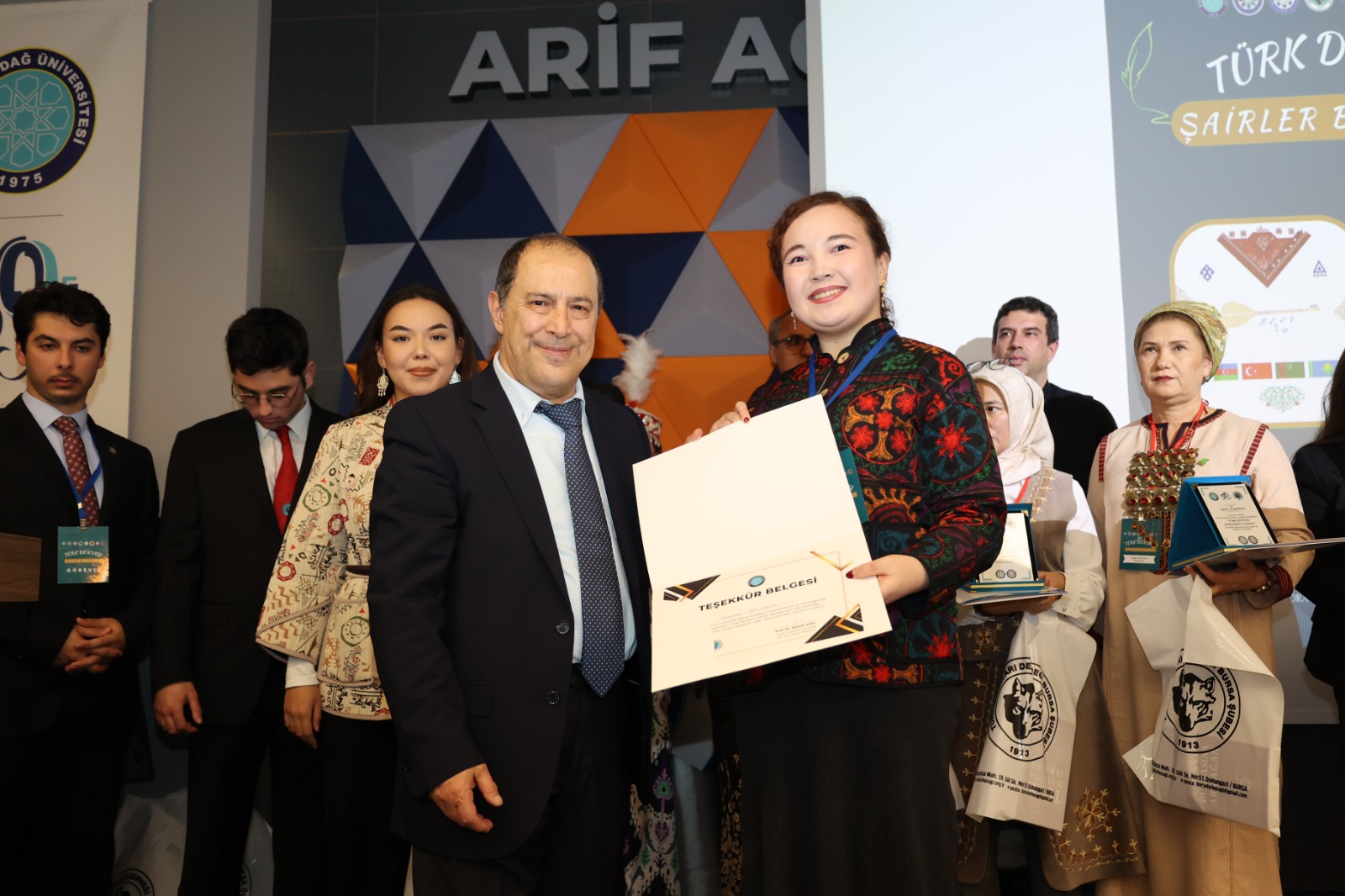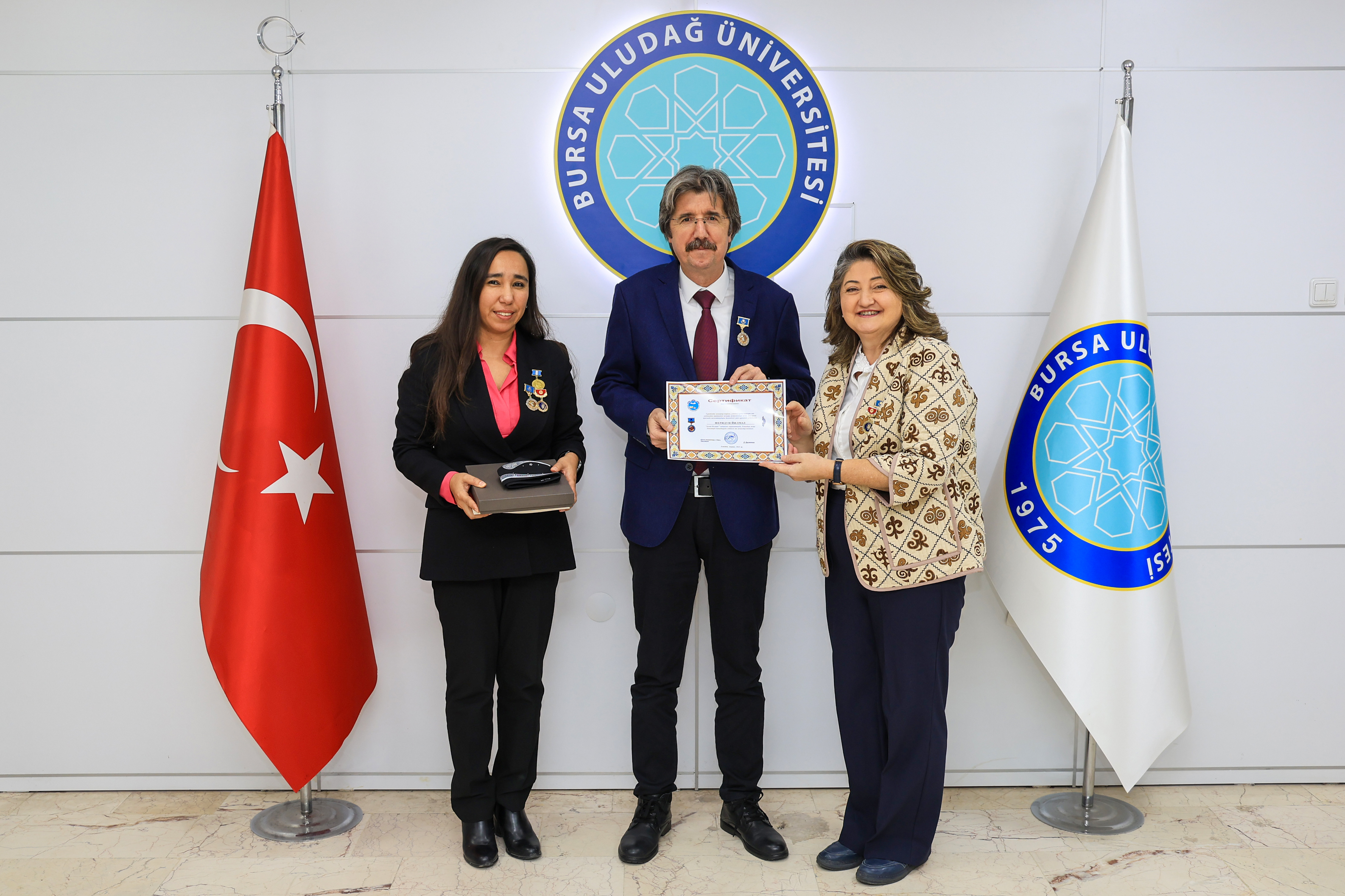 Program kapsamında Türk dünyasına sağladıkları katkılar nedeniyle BUÜ’lü isimlere ödüller verildi. Kırgızistan Uluslararası "Kırgız Akın" Yazarlar Birliği tarafından "Cengiz Aytmatov Madalyası" ile "Teşekkür Mektubu", Kazakistan "Düniye Talanttarı" Birliği tarafından ise "Ahmet Yesevi Madalyası" ile "Teşekkür Belgesi" takdim edildi. Ödüller; BUÜ Rektörü Prof. Dr. Ferudun Yılmaz’a, Türk Ocakları Derneği Bursa Şubesi Başkanı Prof. Dr. Selçuk Kırlı’ya, Türk Dünyası ve Kültürü Topluluğu Danışmanı Prof. Dr. Alev Sınar Uğurlu’ya, Genç Kalemler Topluluğu Danışmanı Doç. Dr. Minara Aliyeva Çınar’a ve BUÜ Ali Şir Nevai Özbek Dil ve Kültür Merkezi'nin kuruluş ve işleyişinde önemli katkıları bulunan Surayyo Khodjoyeva’ya sunuldu. Yurt dışı gezisi nedeniyle törende bulunamayan Rektör Prof. Dr. Ferudun Yılmaz’ın "Ahmet Yesevi Madalyası ve Sertifikası", kendilerine makamında takdim edildi.