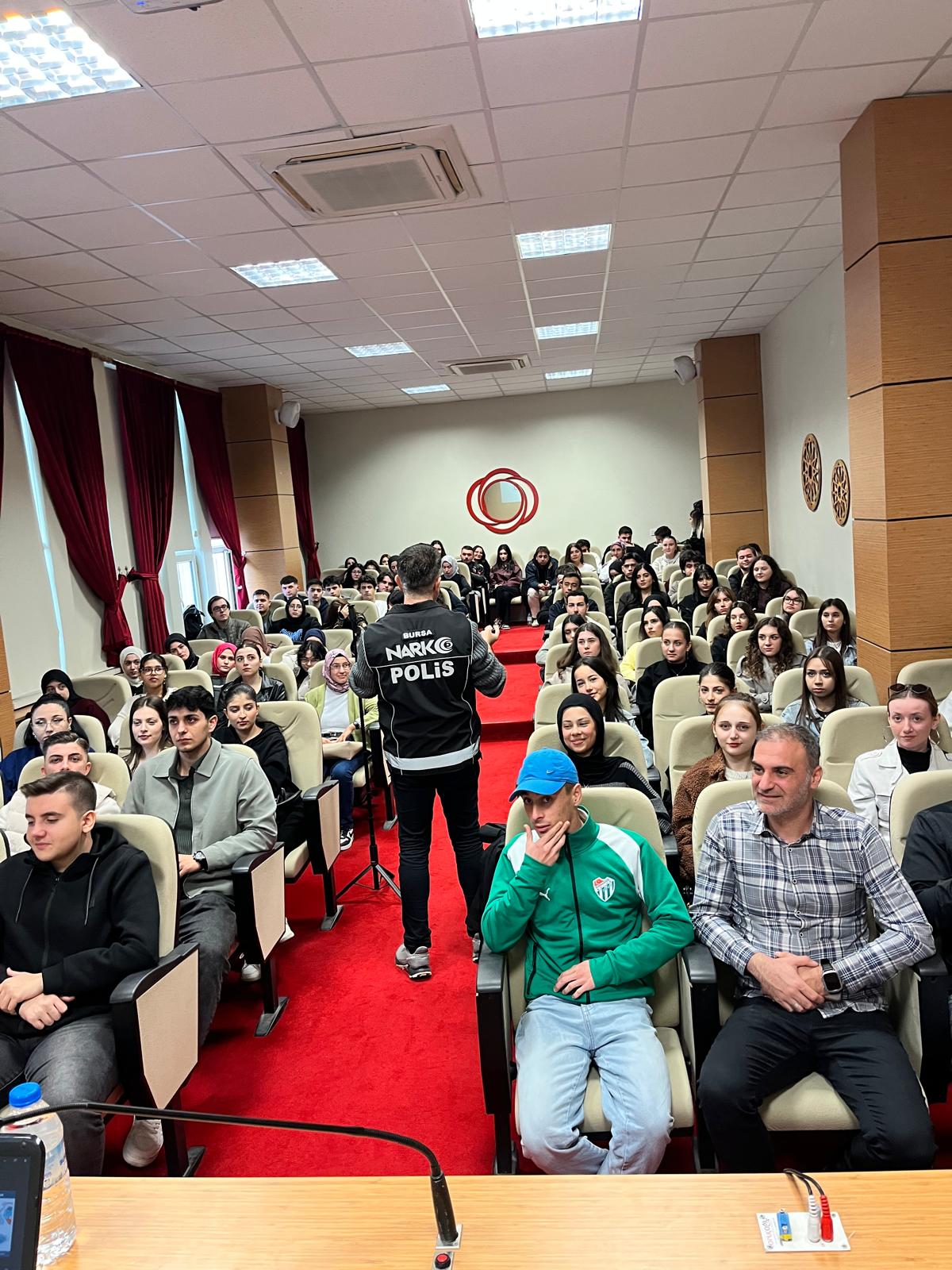 Yüksekokulumuz Farkındalık Seminerleri kapsmaında, öğrencilerin bilinçlendirilmesi ve madde bağımlılığıyla mücadelede toplumsal duyarlılığın artırılması amacıyla önemli bir etkinlik düzenledi. Bursa İl Emniyet Müdürlüğü Narkotik Suçlarla Mücadele Şube Müdürlüğü görevlileri tarafından yürütülen “NarkoRehber Gençlik Modülü” projesi kapsamında öğrencilerimize yönelik kapsamlı bir eğitim programı gerçekleştirildi.