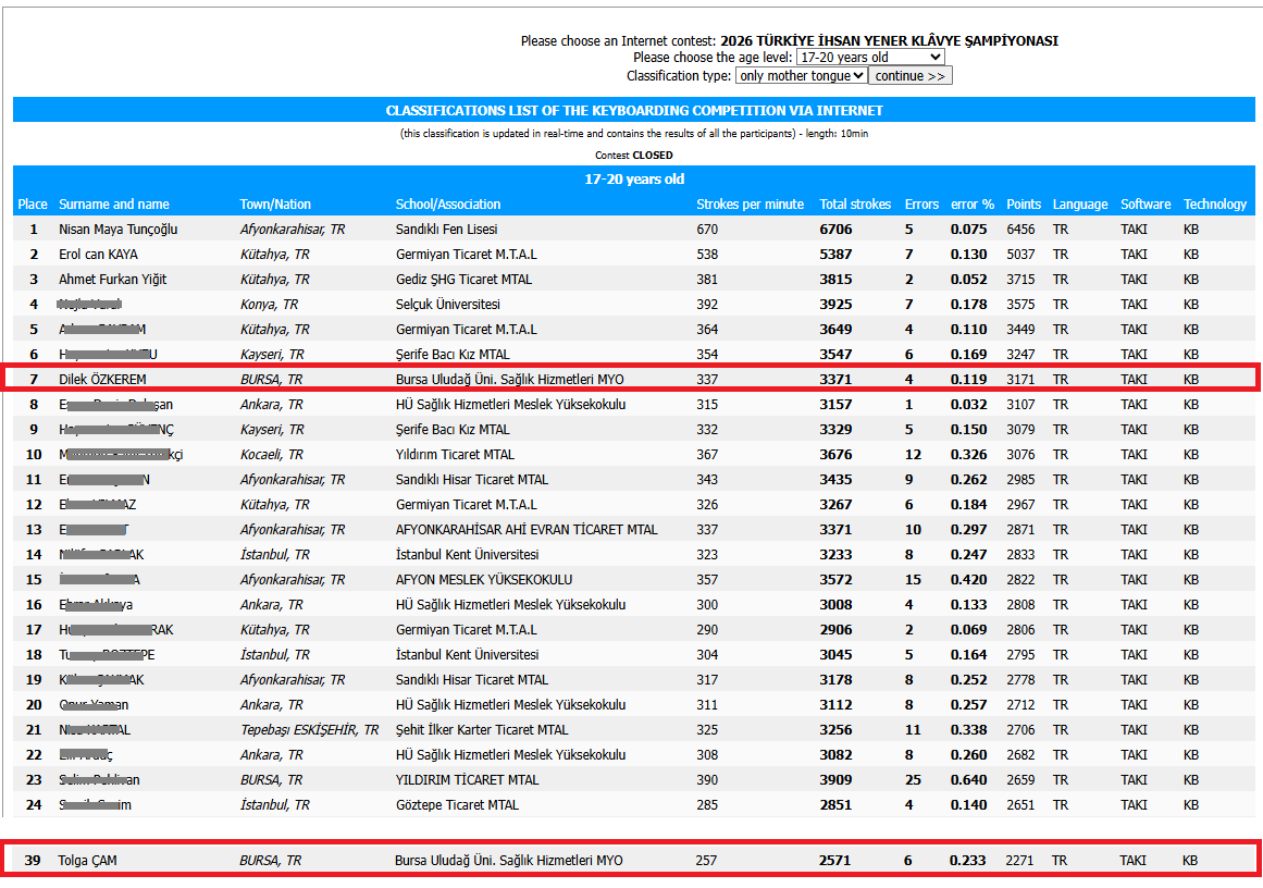 Meslek Yüksekokulumuz Tıbbi Dokümantasyon ve Sekreterlik programından katılan yarışmacılarımız 17-20 yaş Gençler (2 yarışmacı) ve 21-99 yaş Deneyimliler (5 yarışmacı) olmak üzere iki ayrı yaş kategorisinde ve Türkçe anadilde 10 dakikalık hız testi üzerinden yarışmışlardır. Yarışmacılarımızın aldıkları puanlar ve dereceleri şöyledir: