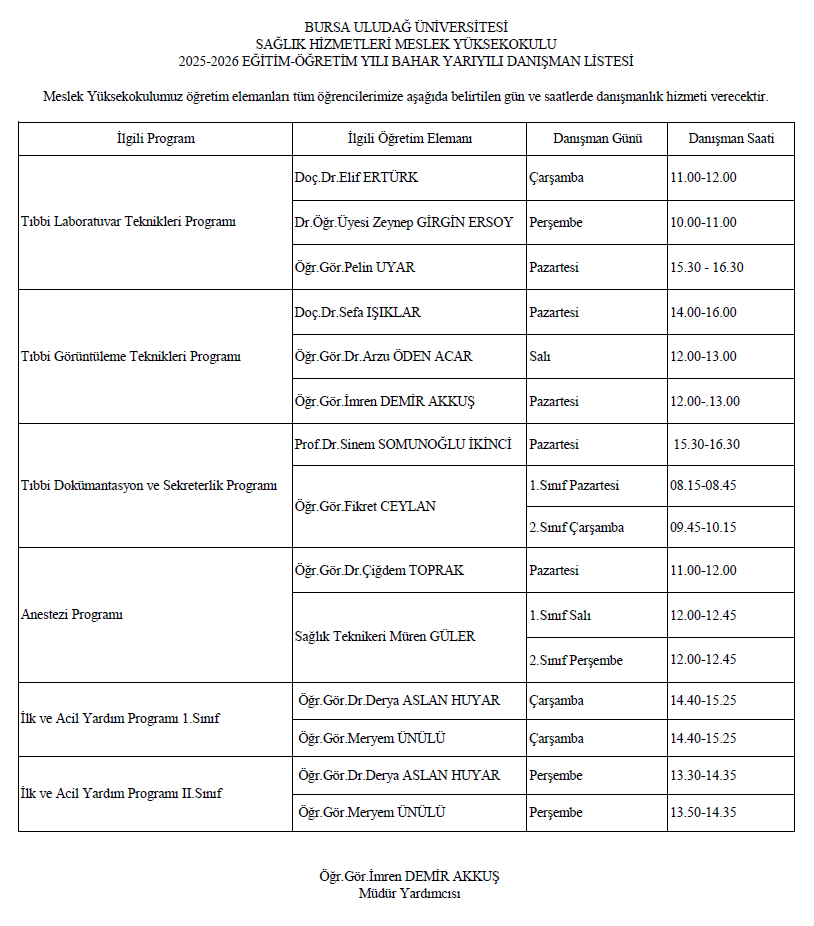 Bahar Yarıyılı Danışmanlık Saatleri Listesi