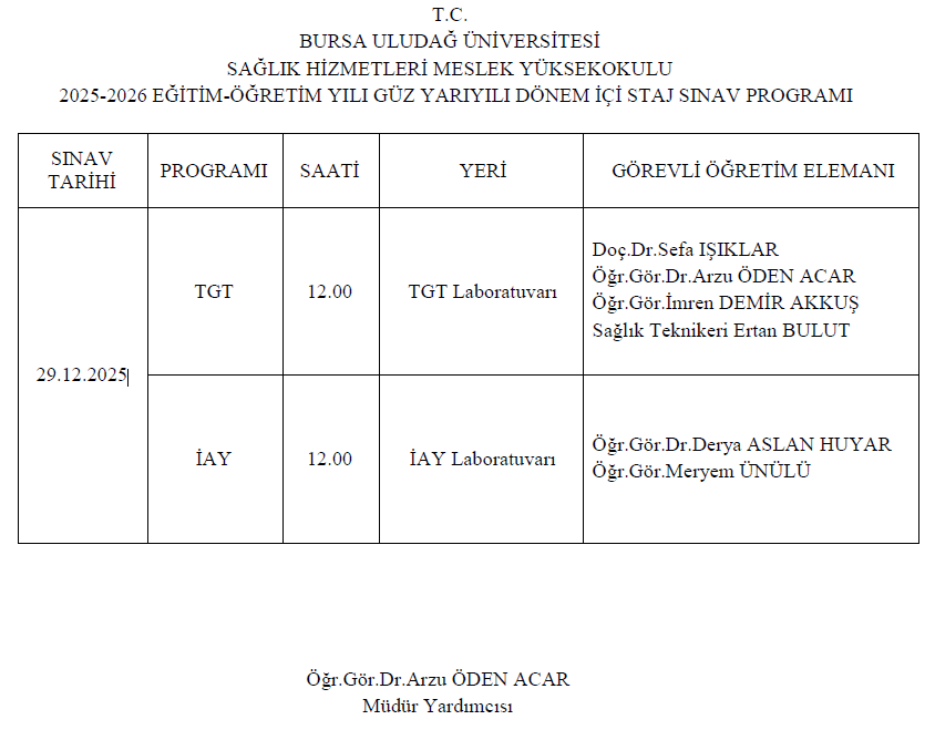 Güz Yarıyılı Dönem İçi Staj Değerlendirme Sınavı Programı