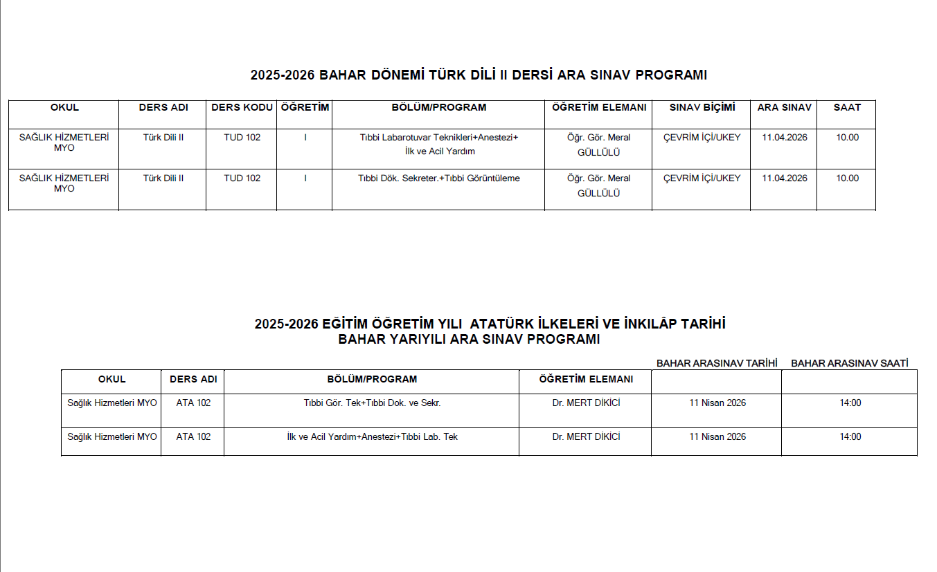 Türk Dili II ve Atatürk İlkeleri ve İnkılap Tarihi II Dersleri Ara Sınav Programları