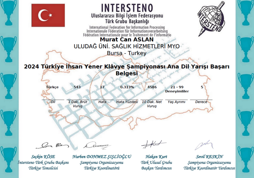 - Murat Can ASLAN dakikada 543 vuruş ve dakikada net 92 kelime ile Türkiye 5’inciliği,