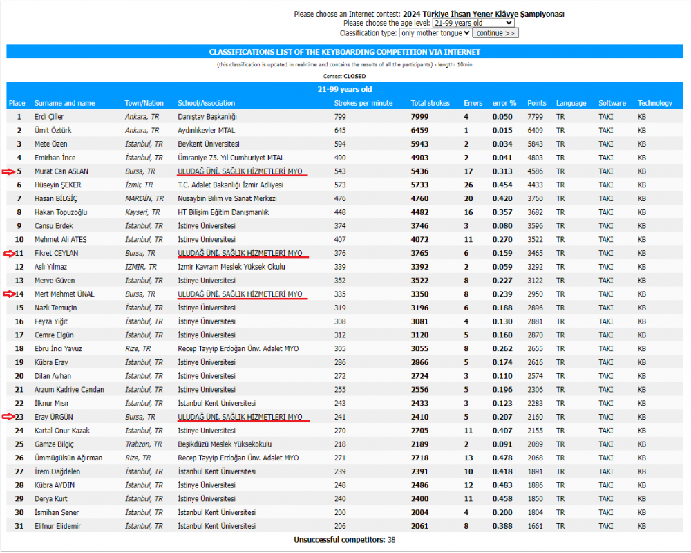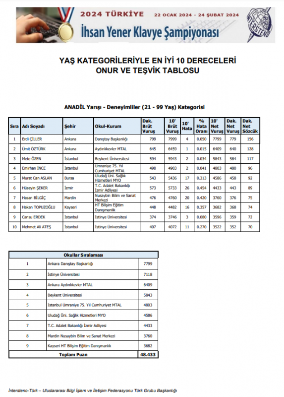 Ülkemizin en büyük internet klavye yarışı olan Türkiye İhsan Yener İnternet Bilgisayar Klâvye Şampiyonası'nın 21’incisi sonuçlandı. Şampiyonaya, bu yıl 28 il ve 81 okuldan toplam 380 kişi katılmıştır. 22 Ocak 2024 – 24 Şubat 2024 tarihlerinde Anadil ve Çok Dilli (17 dil) ayrımıyla 2 yarış türü olarak 4 kategoride (0-12 yaş Küçükler, 13-16 yaş Öğrenciler, 17-20 yaş Gençler ve 21-99 yaş Deneyimliler) düzenlenen yarışlar 25 Şubat 2024 tarihinde sonuçlanmıştır.
