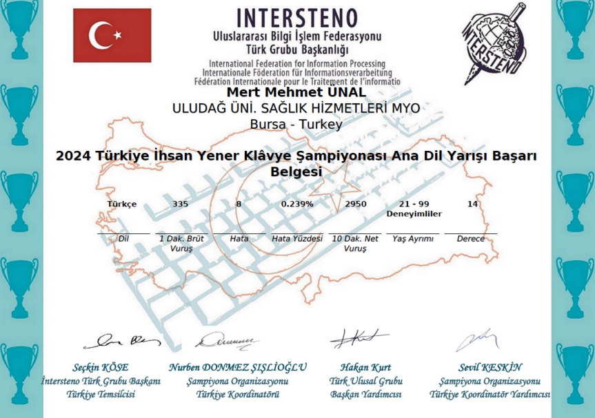 - Mert Mehmet ÜNAL dakikada 335 vuruş ve dakikada net 59 kelime ile Türkiye 14’üncülüğü,