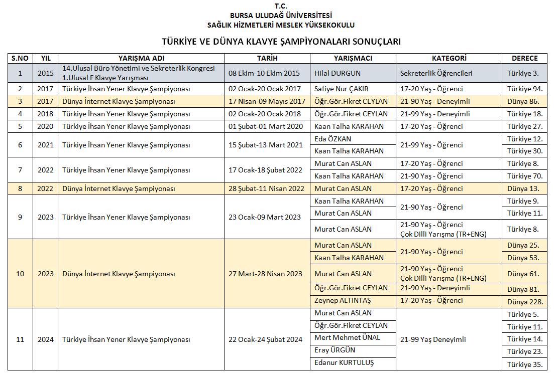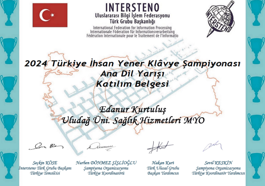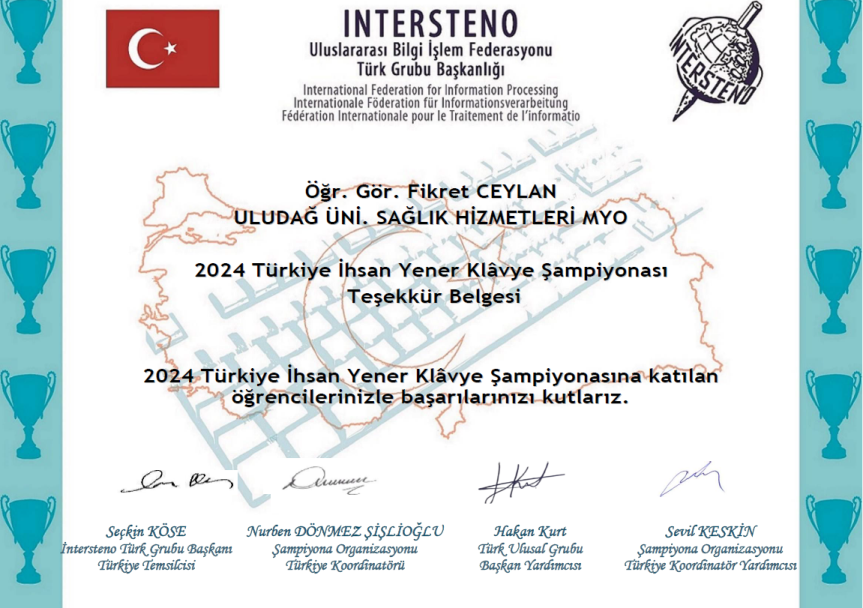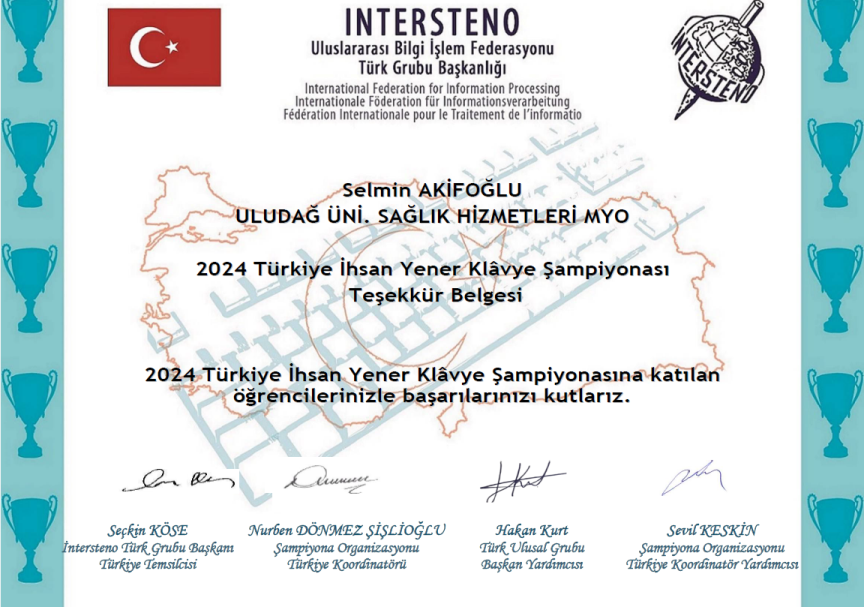 Meslek Yüksekokulumuz bu yılki Türkiye İhsan Yener İnternet Bilgisayar Klâvye Şampiyonası’na Tıbbi Dokümantasyon ve Sekreterlik programından 4 öğrenci ve 1 öğretim görevlisi ile katılım sağlamıştır. Yarışmada Anadil alanında 21-99 yaş Deneyimliler kategorisinde “10 dakikalık hız testi” şeklinde yarışan öğrencilerimiz ve programın öğretim görevlisi başarılı dereceler elde etmiştir.