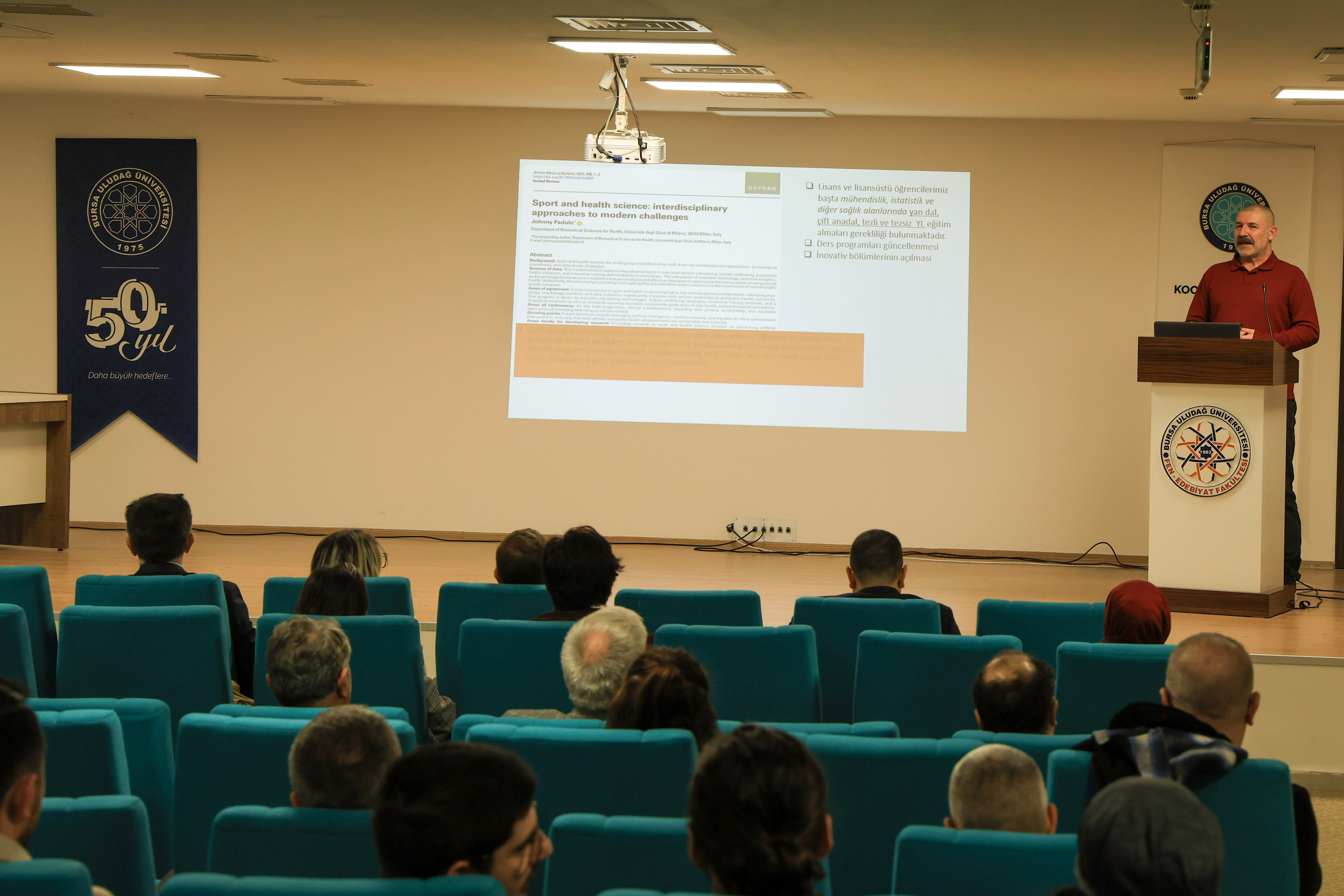 Spor Bilimleri Fakültesi Dekanı Prof. Dr. Ramiz Arabacı, sporun küresel ekonomideki yerini rakamlarla ortaya koyarak, sektörün yıllık 1.4 trilyon dolara kadar ulaşan bir hacme sahip olduğunu belirtti. Spor bilimlerinin sadece sosyal bir alan değil; biyofizik, mühendislik, yapay zeka ve veri bilimiyle iç içe geçmiş devasa bir ekosistem olduğunu vurgulayan Arabacı, günümüzde giyilebilir teknolojiler, VR uygulamaları ve genetik araştırmaların sporcu performansını takip etmede kritik rol oynadığını ifade etti. Bursa’nın spor potansiyelinin bu süreçte büyük bir sinerji yarattığını kaydeden Arabacı, geleceğin spor bilimcilerinin mühendislikten istatistiğe kadar farklı alanlarda çift anadal veya yan dal yaparak kendilerini çok yönlü geliştirmeleri gerektiğinin altını çizdi.