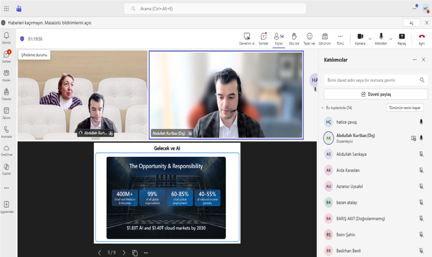 Teknik Bilimler Meslek Yüksekokulu Bilgisayar Programcılığı Programında; mezun öğrencimiz Microsoft Azure Platfomunda görevli Sr. Solution Engineer Abdullah Kurtbaş 17.12.2025 tarihinde Dublin’den online olarak öğrencilerimizle Yapay Zeka ve Değişen Meslekler ile ilgili bilgilerini ve geleceğin meslekleri için önemli yol haritalarını ve tavsiyelerini paylaştı.