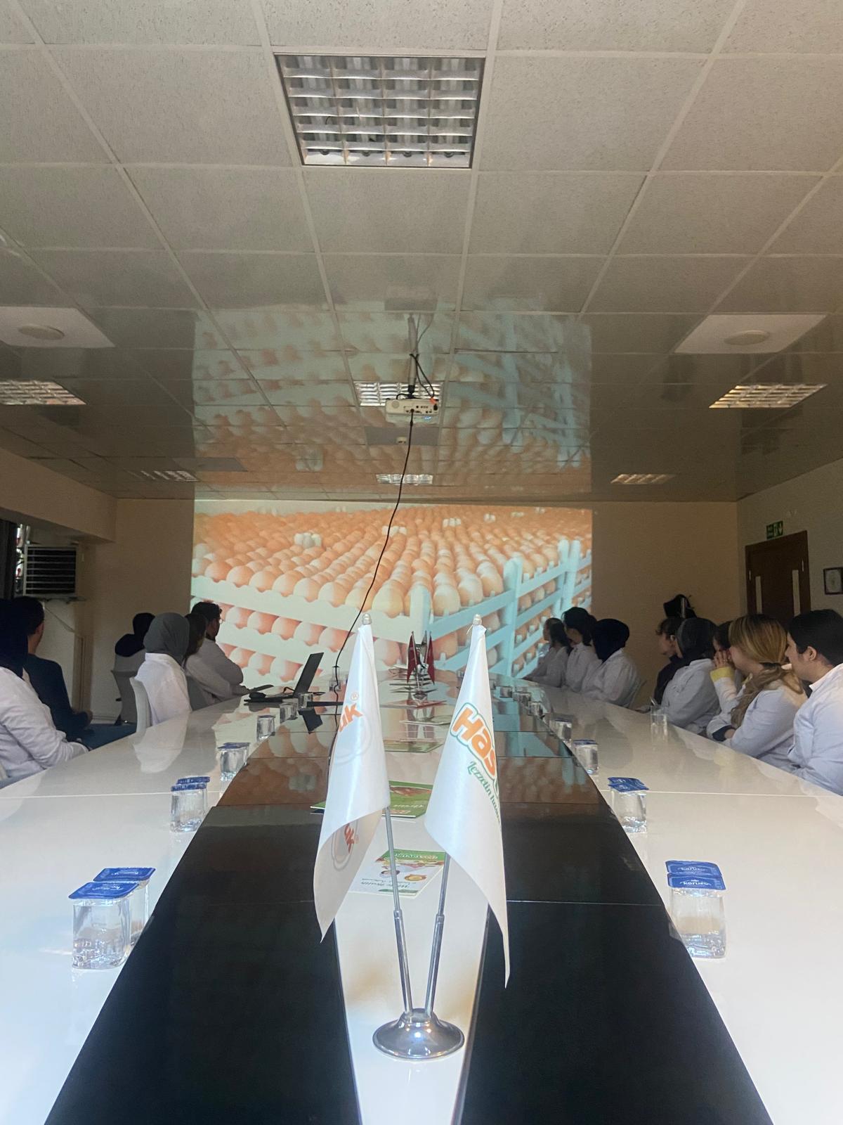 Teknik geziye fabrika tanıtımının ve üretim aşamalarının anlatıldığı eğitim ile başlandı. Eğitimde Kalite Müdür Yardımcısı Gıda Müh. Özgür SANA Has Tavuk’un sahip olduğu Aeroscalder teknolojisi sayesinde; tavukların tüylerinin yoğunlaştırılmış hava akımı kullanılarak yumuşatıldığını tavukların birbirine hiç temas etmeden en hijyenik şekilde üretildiğini ve su yerine yoğun hava kullanılarak yapılan soğutma sayesinde, tavukların doğal renkleri ve kokularının korunduğunu anlatarak çiftlikten sofraya kadar kesintisiz uygulanan bu 4 aşamalı hijyen bariyeri sayesinde ürünlerin gıda güvenliği zincirinin ve hijyen kurallarının bozulmadan üretiminin devam ettiğini belirtti. Bunlarla birlikte Gıda Müh. Özgür SANA kuru kesim tekniğinin Türkiye’de uygulayan ilk fabrika olan Has Tavuk ’un kuru kesim ile daha lezzetli, daha yumuşak, daha hijyenik tavuk üretimi yapıldığının önemini vurguladı. Ayrıca tavukların kesiminin “helal kesim” ile gerçekleştirildiğinin altını çizdi.