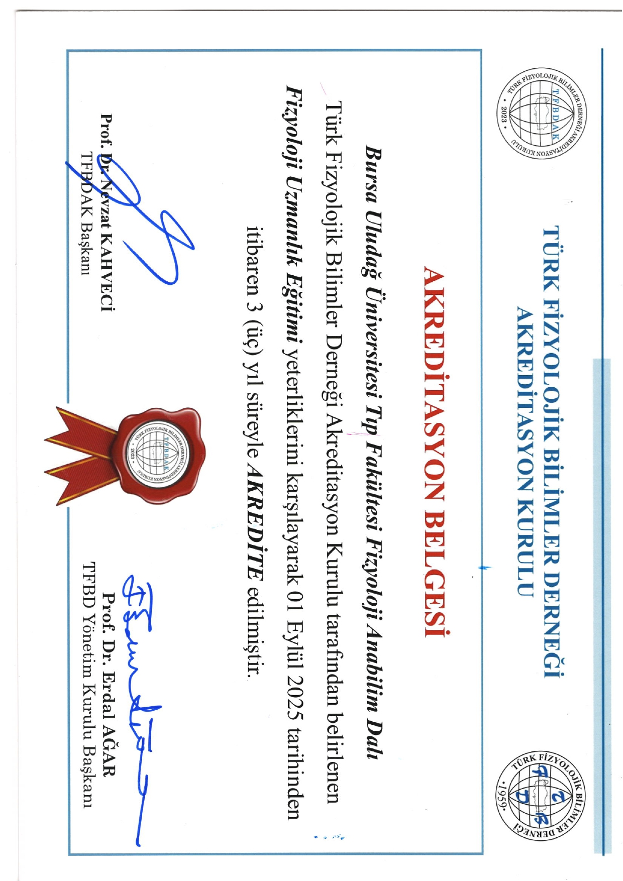 Bursa Uludağ Üniversitesi Fizyoloji Anabilim Dalı Akreditasyon Aldı
