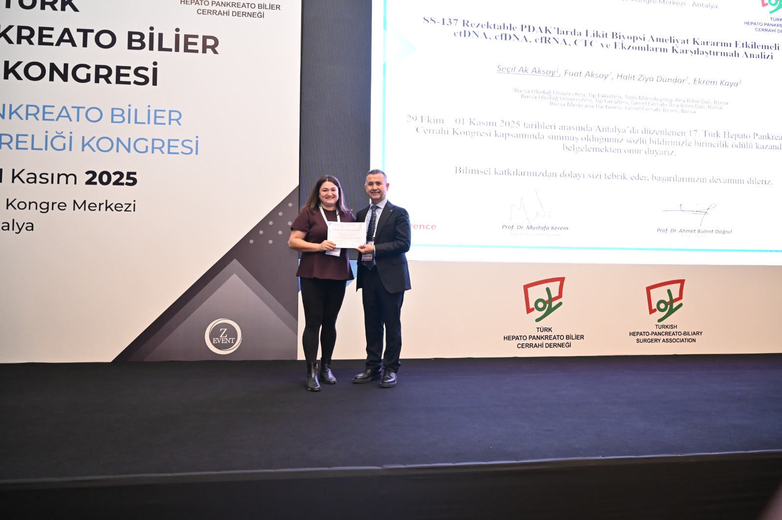 Bursa Uludağ Üniversitesi Tıp Fakültesi, 17. Türk Hepatopankreatobiliyer Cerrahi Kongresi’nde genel cerrahi anabilim dalı hepatobiliyer cerrahi bölümünün öncülüğünde yürütülen multidisipliner araştırmalarla önemli bir başarıya imza attı. Fakültemiz öğretim üyeleri ve araştırmacıları, bilimsel sunumlarıyla “En İyi Sözlü Bildiri” kategorisinde hem birincilik hem de ikincilik ödüllerine layık görüldü.