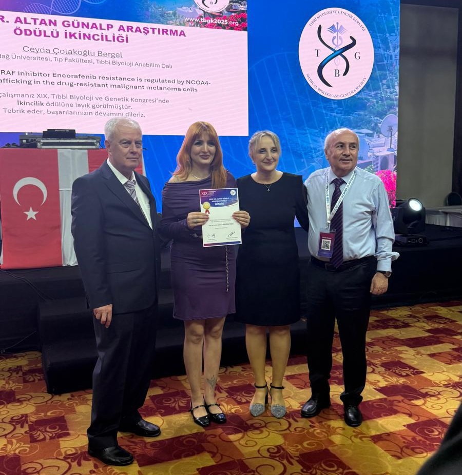 Bursa Uludağ Üniversitesi Tıp Fakültesi Tıbbi Biyoloji Anabilim Dalı araştırma ekibi; Dr. Ceyda Çolakoğlu Bergel, Doç. Dr. Işıl Ezgi Eryılmaz, Prof. Dr. Gülşah Çeçener ve Prof. Dr. Ünal Egeli, 27-30 Ekim 2025 tarihlerinde Bodrum’da düzenlenen XIX. Tıbbi Biyoloji ve Genetik Kongresi’nde, ülkemizde Tıbbi Biyoloji alanında araştırmacıları teşvik eden ve bilimsel niteliğiyle prestijli bir konuma sahip olan Prof. Dr. Altan Günalp Araştırma İkincilik Ödülü’ne layık görüldü.