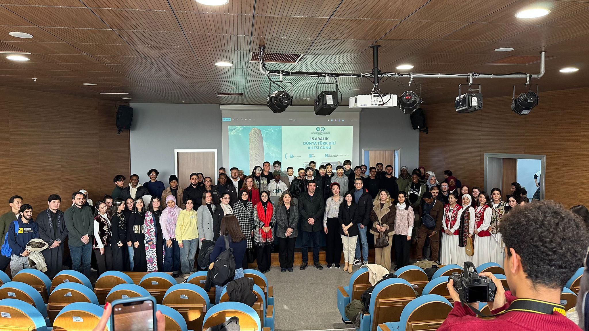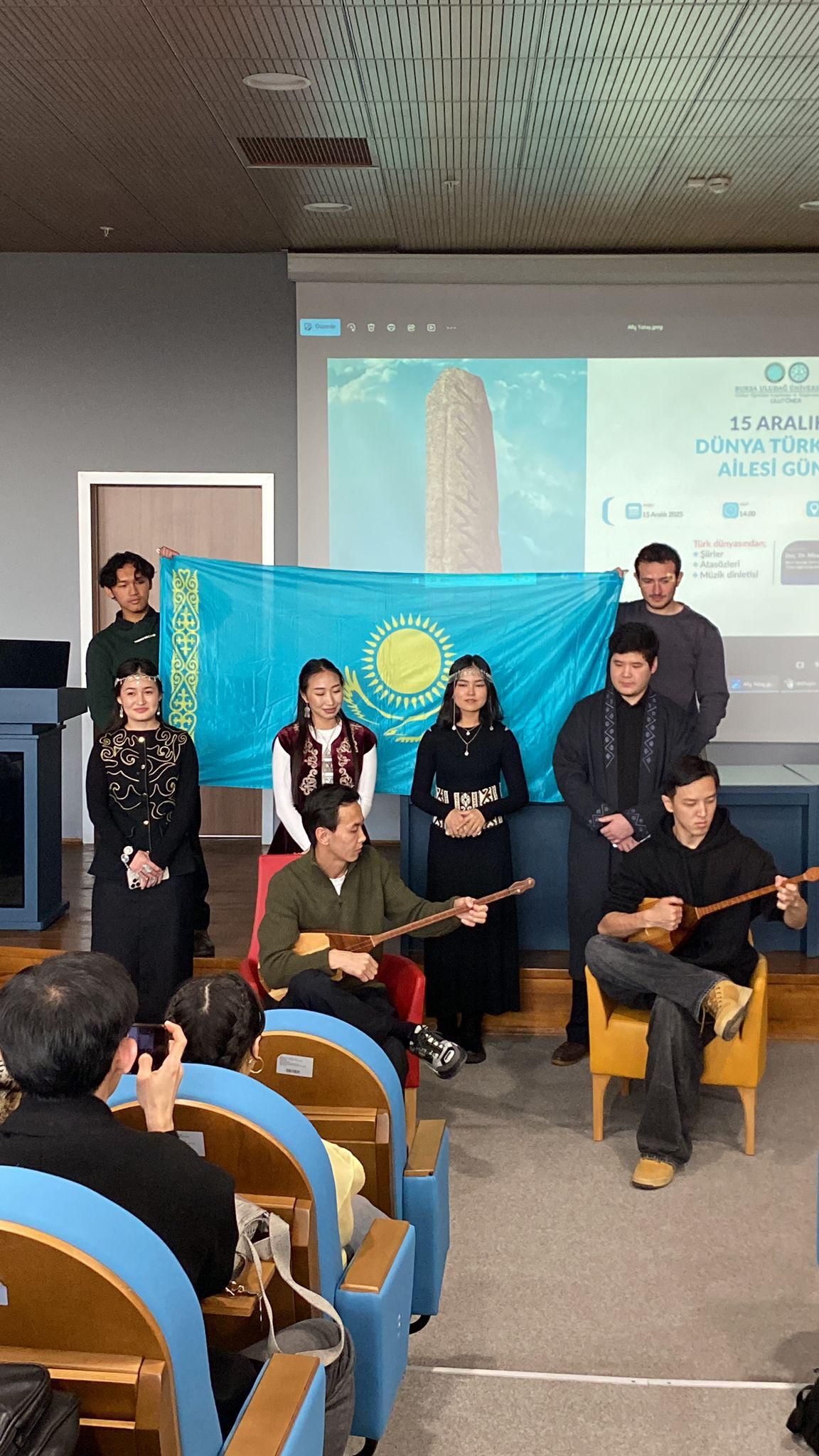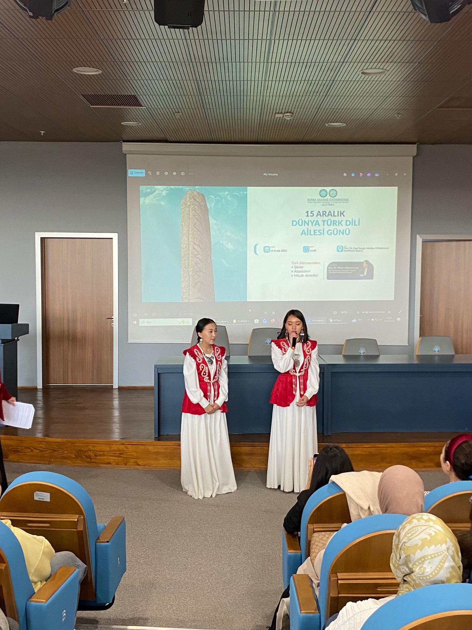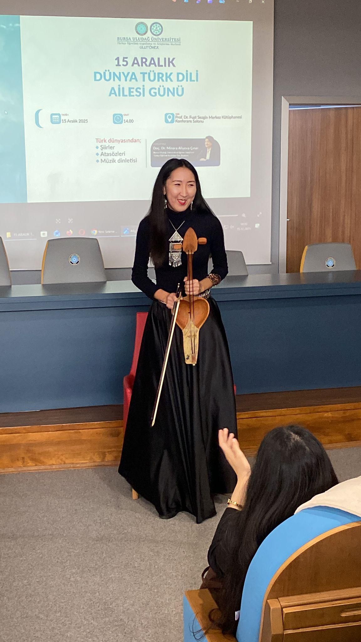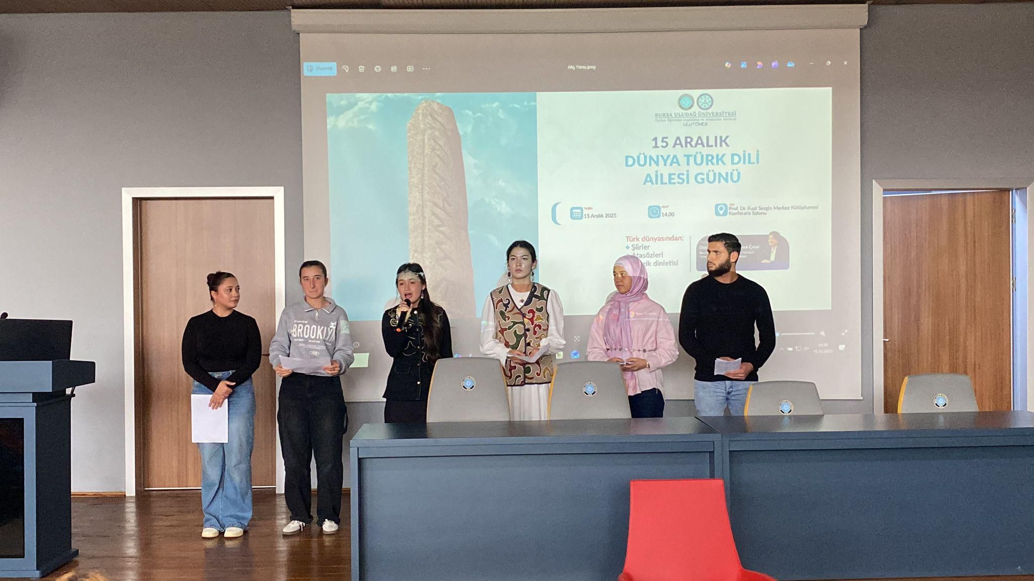 “15 Aralık Dünya Türk Dili Ailesi Günü” programı, 15.11.2025 tarihinde Bursa Uludağ Üniversitesi Prof. Dr. Fuat Sezgin Merkez Kütüphanesi Konferans Salonu’nda gerçekleştirildi. Ana Bilim Dalı Başkanımız Doç. Dr. Minara ALİYEVA ÇINAR, konuşmasında akademik çalışmalardan hareketle Türkçenin dünya dilleri arasındaki yerini anlattı. Türkçenin günümüzde Asya’dan Balkanlar’a kadar uzanan geniş bir coğrafyada konuşulan zengin bir dil olduğunu ve köklü bir medeniyeti temsil ettiğini ifade etti. Başkanımız aynı zamanda uluslararası öğrencilerin dilimizi öğrenmesinden duyduğu memnuniyeti dile getirdi ve bu öğrencilerin Türkçenin etki alanının genişlemesine sundukları katkıya dikkat çekti.
