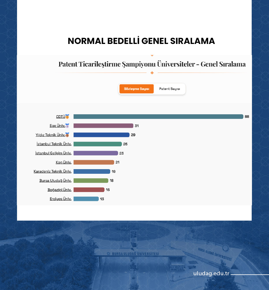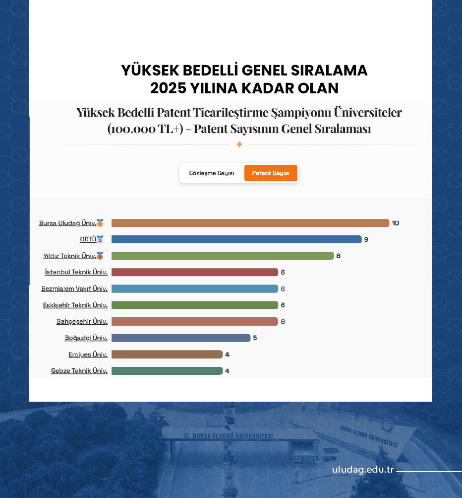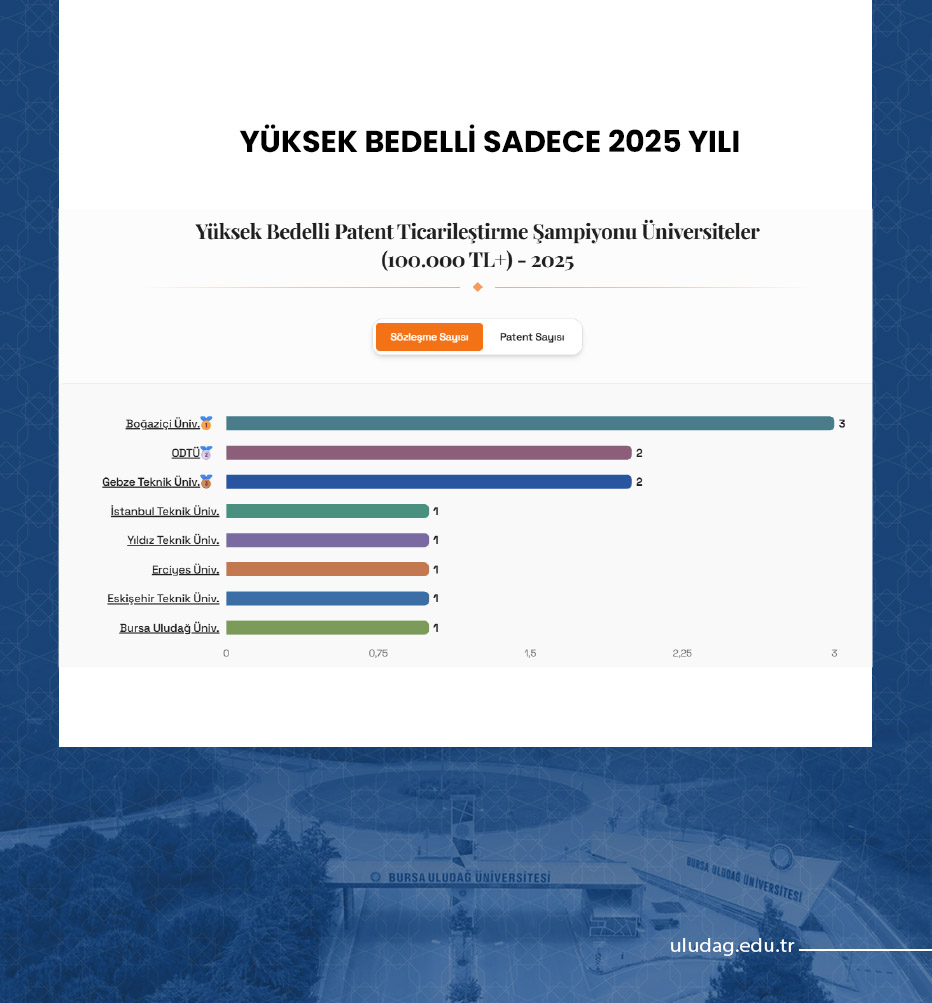 Açıklanan raporda bu yıl ilk defa Üniversitelerin yüksek bedelli (100.000 TL+) patent ticarileştirme performansları incelendi. Üniversitelerin değer odaklı ticarileştirme kapasitesini daha net ortaya koyan bu segmentte Bursa Uludağ Üniversitesi, yüksek bedelli ticarileşen patent sayısına göre yapılan genel sıralamada; ticarileşen 10 patenti ile diğer yükseköğretim kurumlarını geride bırakarak en iyi Üniversite olma başarısına ulaştı ve 1.lik koltuğuna oturdu. BUÜ, 2025 Yılı Yüksek Bedelli Patent Ticarileştirme kategorisinde ise en iyi 4 üniversiteden biri olarak gösterildi. Ayrıca bir diğer kategoride, 2025 yılı sonu itibarıyla üniversitelerin patent ticarileştirme performansları hem sözleşme sayısı hem de lisanslanan veya devir edilen patent sayısı (kümülatif) açısından birlikte değerlendirildiğinde; BUÜ 18 ticarileştirme ile 8. sırada yer almayı başardı.
