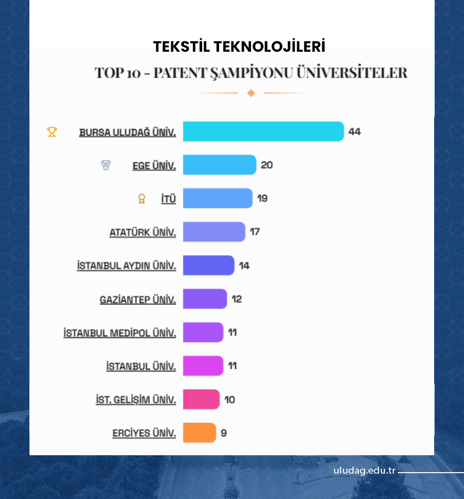 Tekstil Teknolojileri kategorisindeki istatistikler kısmında ise en fazla patente sahip üniversiteler arasında Türkiye’nin en iyisi bir kez daha BUÜ oldu. Tekstil Teknolojileri kategorisindeki bu başarısını uzun süredir elinde tutan BUÜ; ilk defa Otonom Teknolojileri kategorisinde de en iyi 4 üniversite arasında gösterildi. Kuruluşunun 51. Yılını kutlayan BUÜ, Batarya Teknolojileri Kategorisinde, bir önceki yıla göre 2 sıra yükselişe geçerek, ilk 5 arasında; Gıda ve İçecek Teknolojileri Kategorisinde yerini koruyarak en iyi 6 üniversite arasında; Robotik Teknolojiler Kategorisinde bir önceki yıla göre 2 sıra yükselişe geçerek, en iyi 7 üniversite arasında; Otomotiv Teknolojileri Kategorisinde yerini koruyarak en iyi 8 üniversite arasında yer aldı. Havacılık ve Savunma Teknolojileri ile Üretim ve Yapı İşleri Teknolojileri Kategorisinde ise 9. sırada bulunan BUÜ, Eklemeli İmalat Teknolojileri Kategorisinde ve İleri Malzeme Teknolojileri Kategorisinde de 10. sıraya yerleşti.