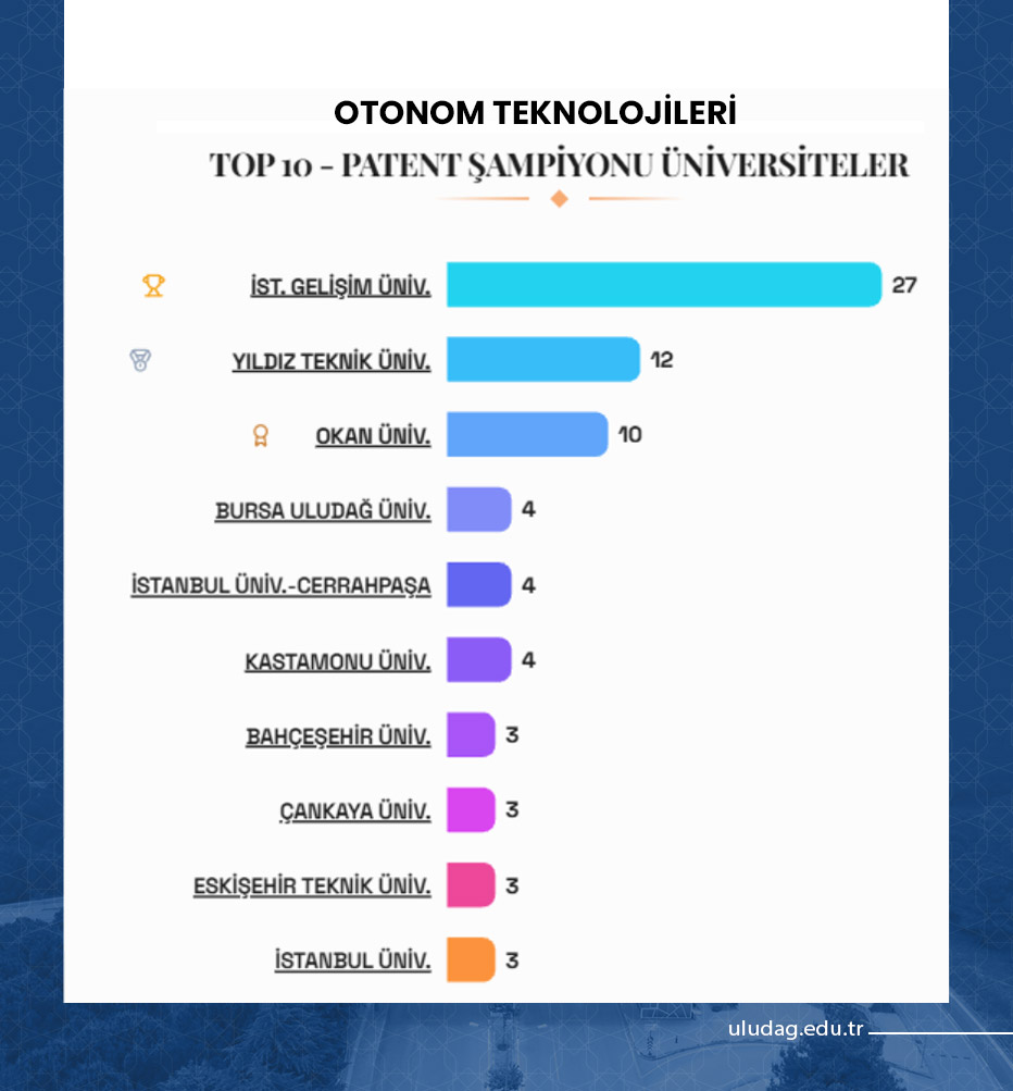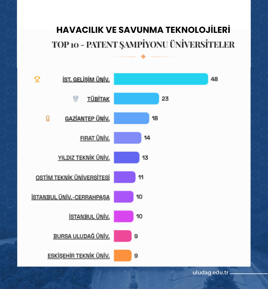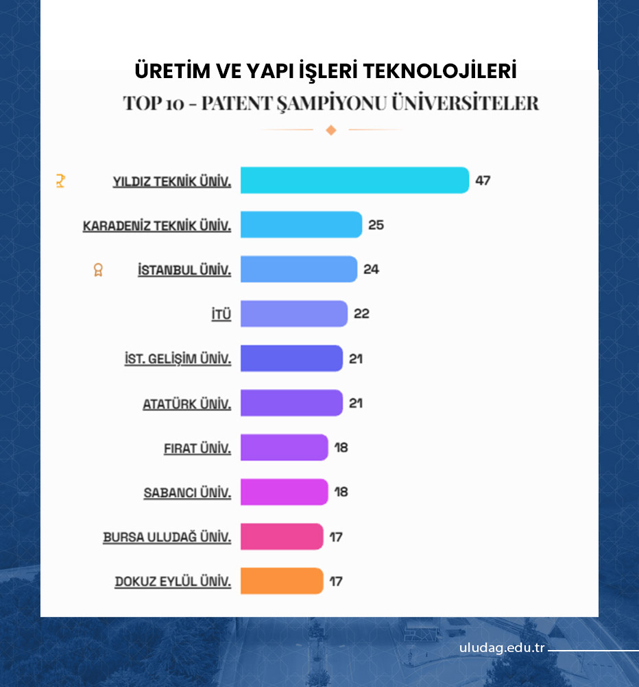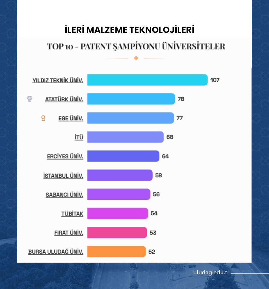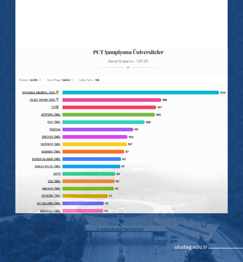 Raporda ilk olarak üniversitelerin uluslararası patent başvurularına yer verildi. Bu alanda yaklaşık 10 yıldır en iyiler arasında yer alan BUÜ, 2025 yılında yayınlanan Uluslararası Patent Başvuruları (PCT) sıralamasında, bir önceki yıla göre 2 sıra öne çıkarak, sıralamada 2. olarak yer aldı. Üniversitelerin portföylerinde bulunan toplam patent başvurularının sıralandığı listede ise yine bir önceki yıla göre 2 sıra öne çıkan BUÜ, 10. oldu.