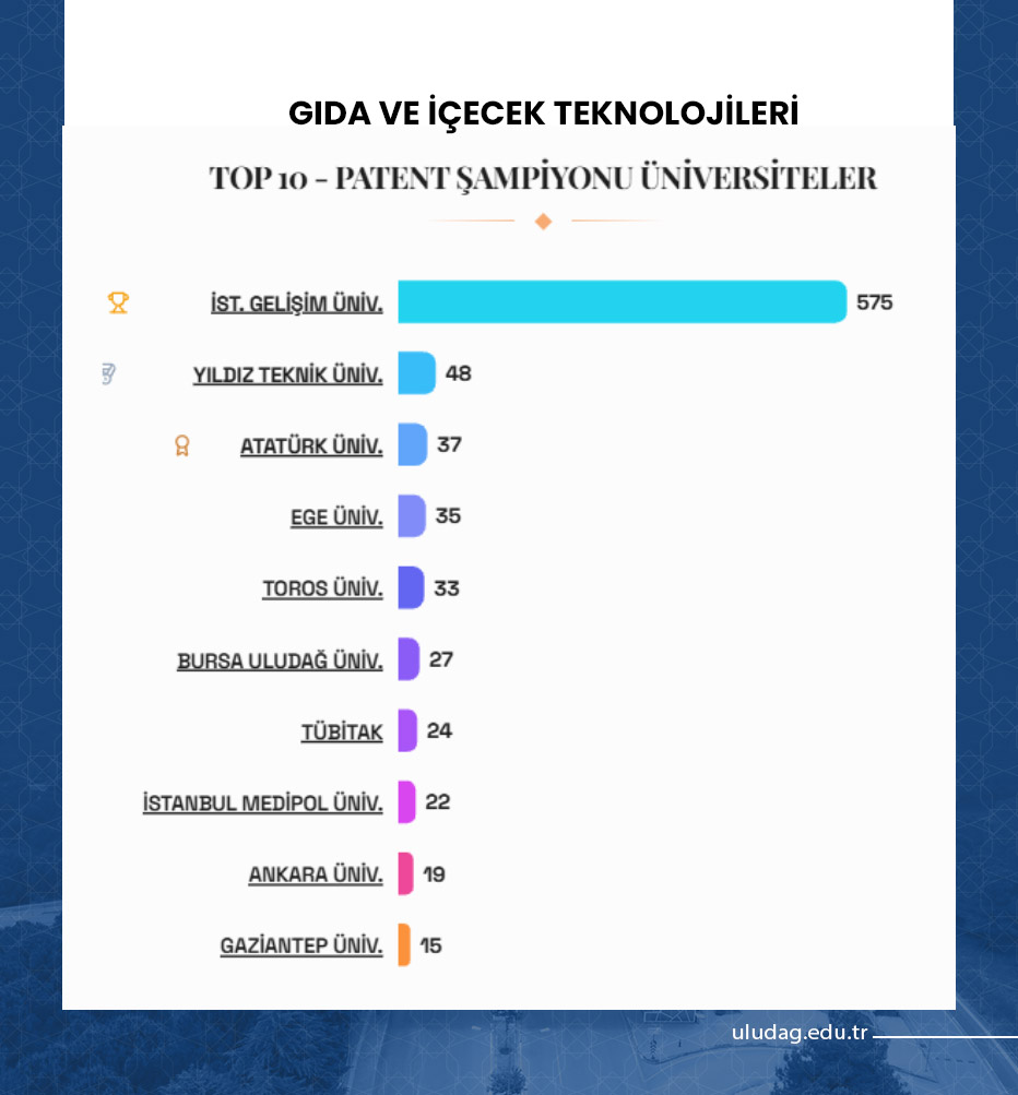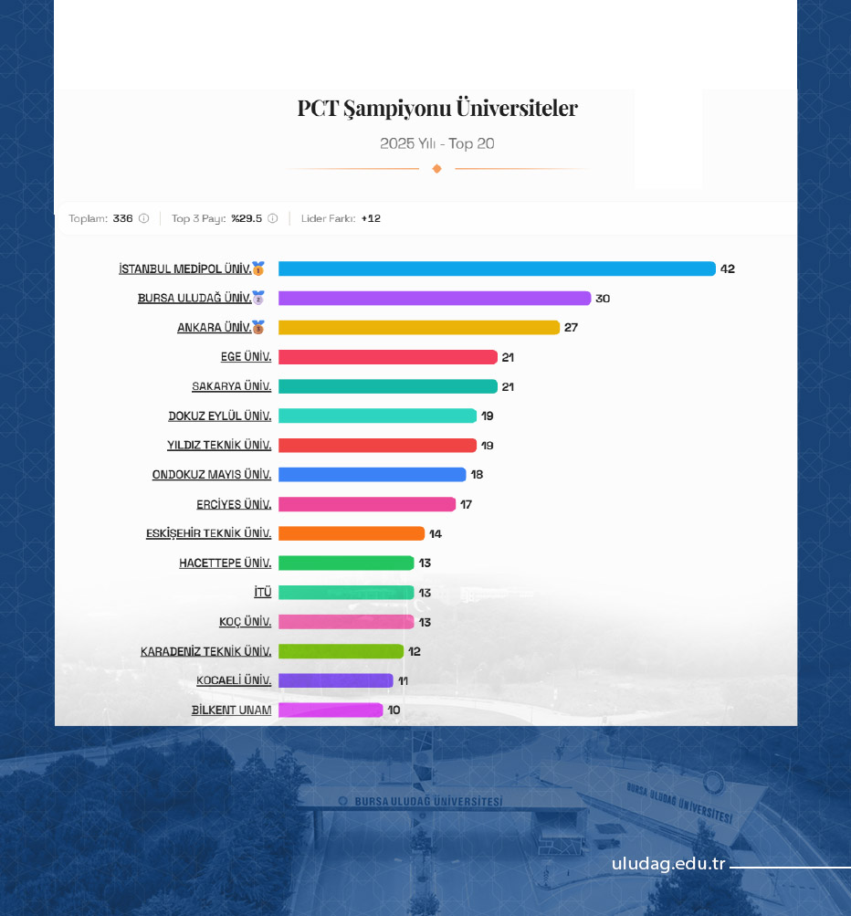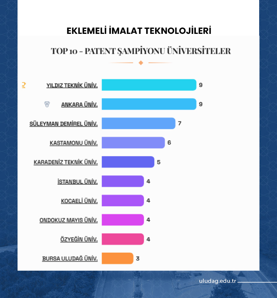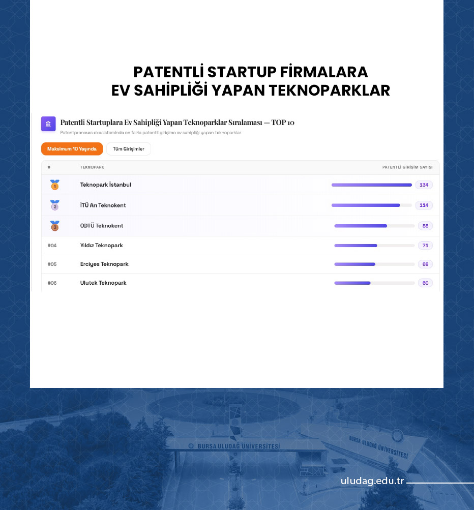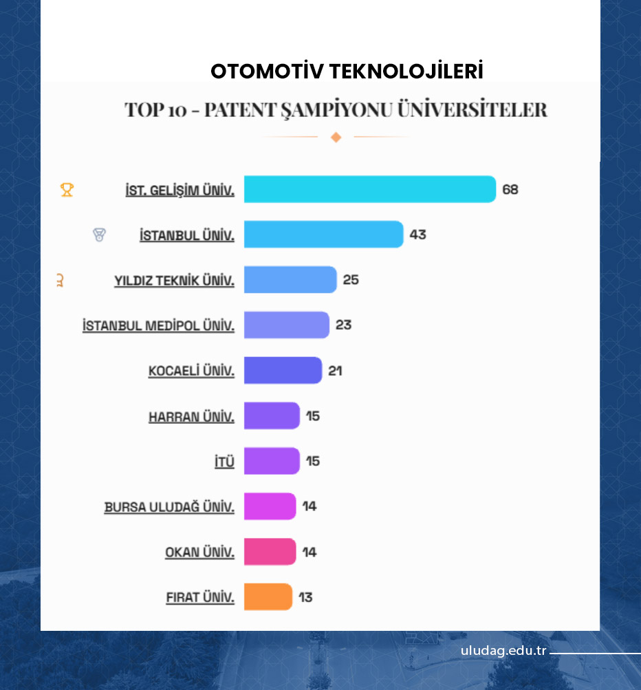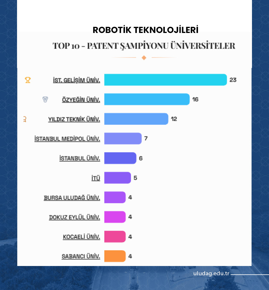 Raporda ilk olarak üniversitelerin uluslararası patent başvurularına yer verildi. Bu alanda yaklaşık 10 yıldır en iyiler arasında yer alan BUÜ, 2025 yılında yayınlanan Uluslararası Patent Başvuruları (PCT) sıralamasında, bir önceki yıla göre 2 sıra öne çıkarak, sıralamada 2. olarak yer aldı. Üniversitelerin portföylerinde bulunan toplam patent başvurularının sıralandığı listede ise yine bir önceki yıla göre 2 sıra öne çıkan BUÜ, 10. oldu.