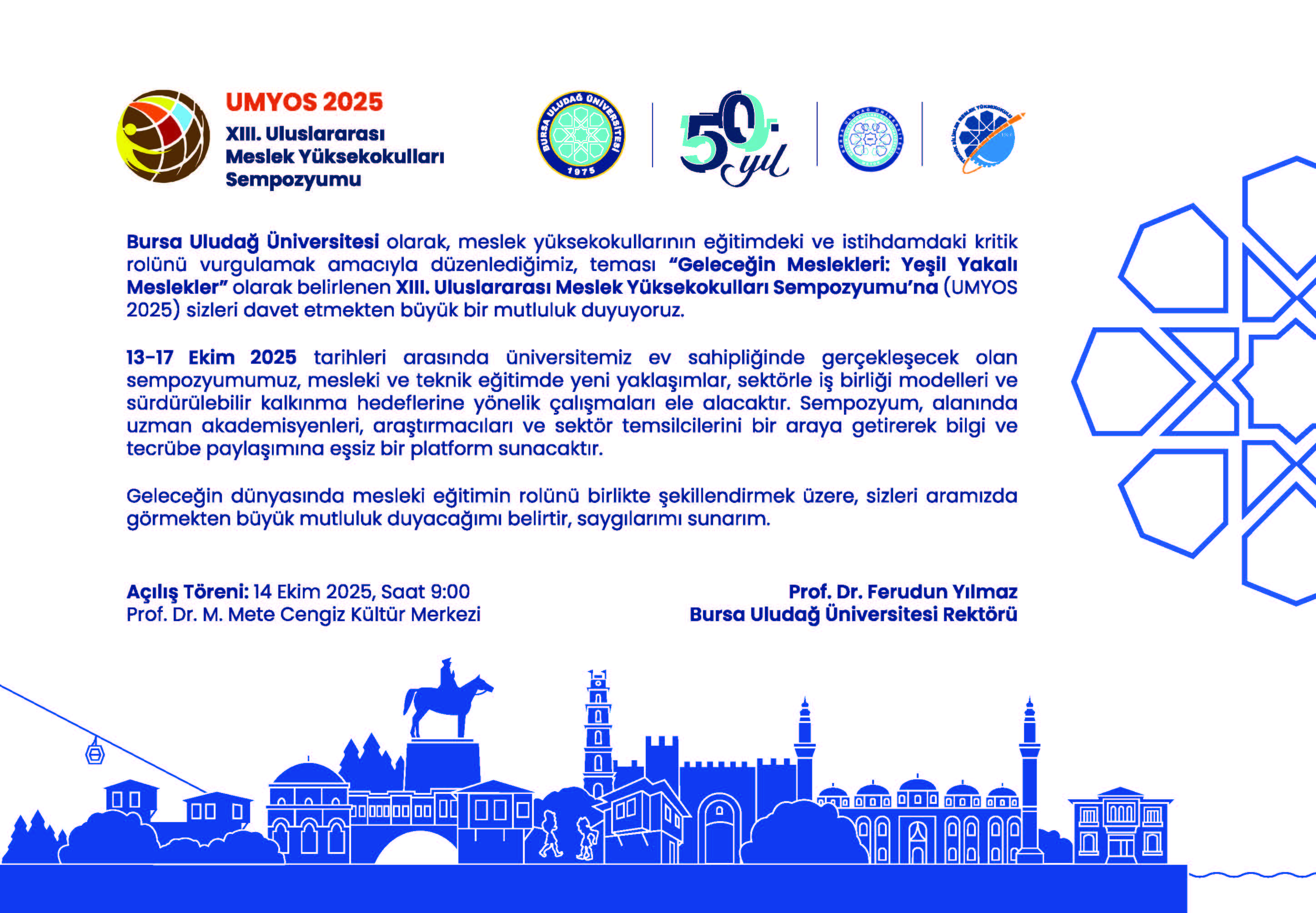 BUÜ Prof. Dr. Mete Cengiz Kültür Merkezi’nde 13-17 Ekim tarihleri arasında düzenlenecek sempozyumda mesleki eğitimin geleceğinin şekillendirilmesinde uluslararası bir organizasyon olan Uluslararası Meslek Yüksekokulları Sempozyumu’nun (UMYOS) 13.’süne ev sahipliği yapacak. BUÜ’nün yarım asırlık akademik birikimini geleceğe taşıyan bu sempozyum, ulusal ve uluslararası düzeyde akademisyenleri, sektör temsilcilerini, kamu kurumlarını ve öğrencileri bir araya getirecek. Etkinlik, mesleki eğitimin küresel dönüşümünde yeşil ekonomi, dijital dönüşüm ve sürdürülebilir kalkınma ekseninde yeni bir vizyon ortaya koymayı hedefliyor.