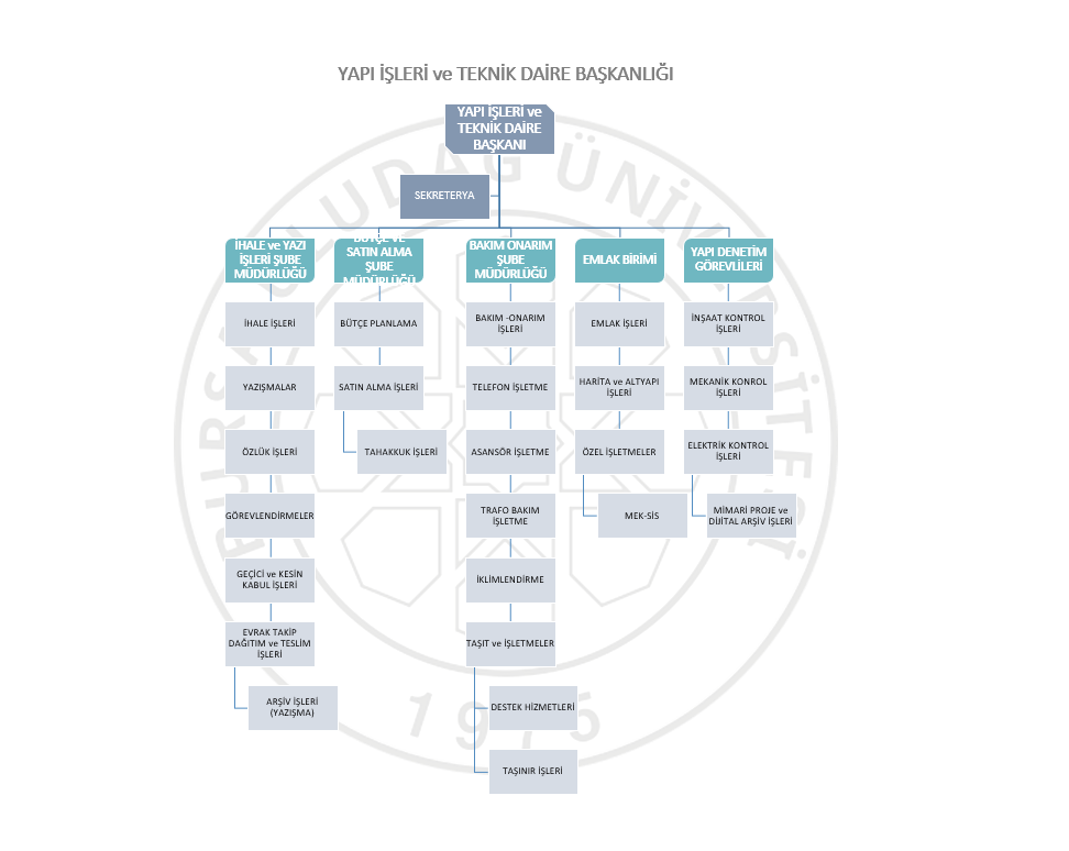 Yapı İşleri ve Teknik Daire Başkanlığı 2547 sayılı kanunun 51. Maddesine dayanılarak 124 sayılı Yükseköğretim Üst Kuruluşları ile Yükseköğretim Kurumlarının idari teşkilatı hakkında kanun hükmünde kararnamenin 28. Maddesine istinaden kurulmuştur. (Karar Tarihi:07/10/1983 Karar No:KHK/124,Madde 28)2.Görev